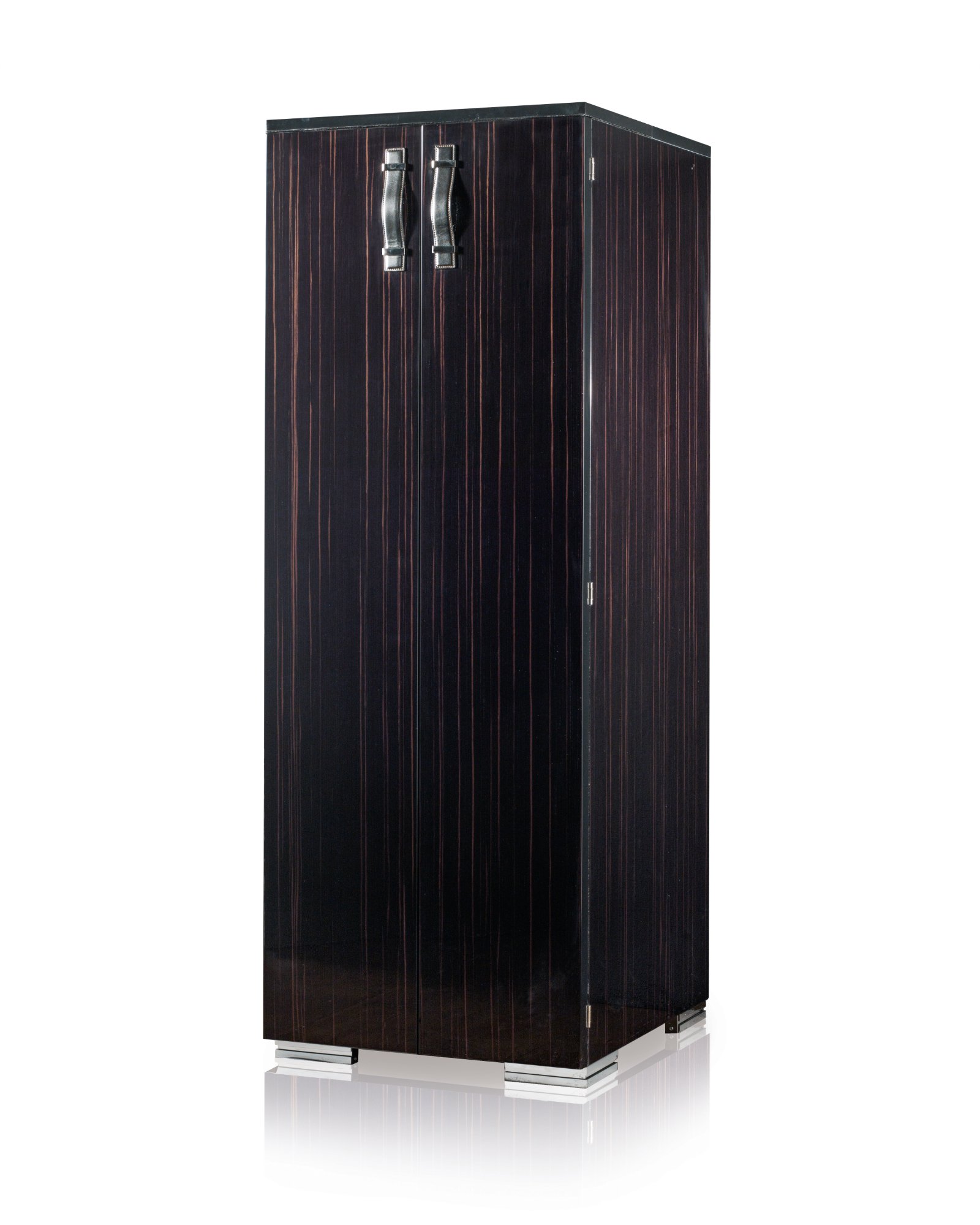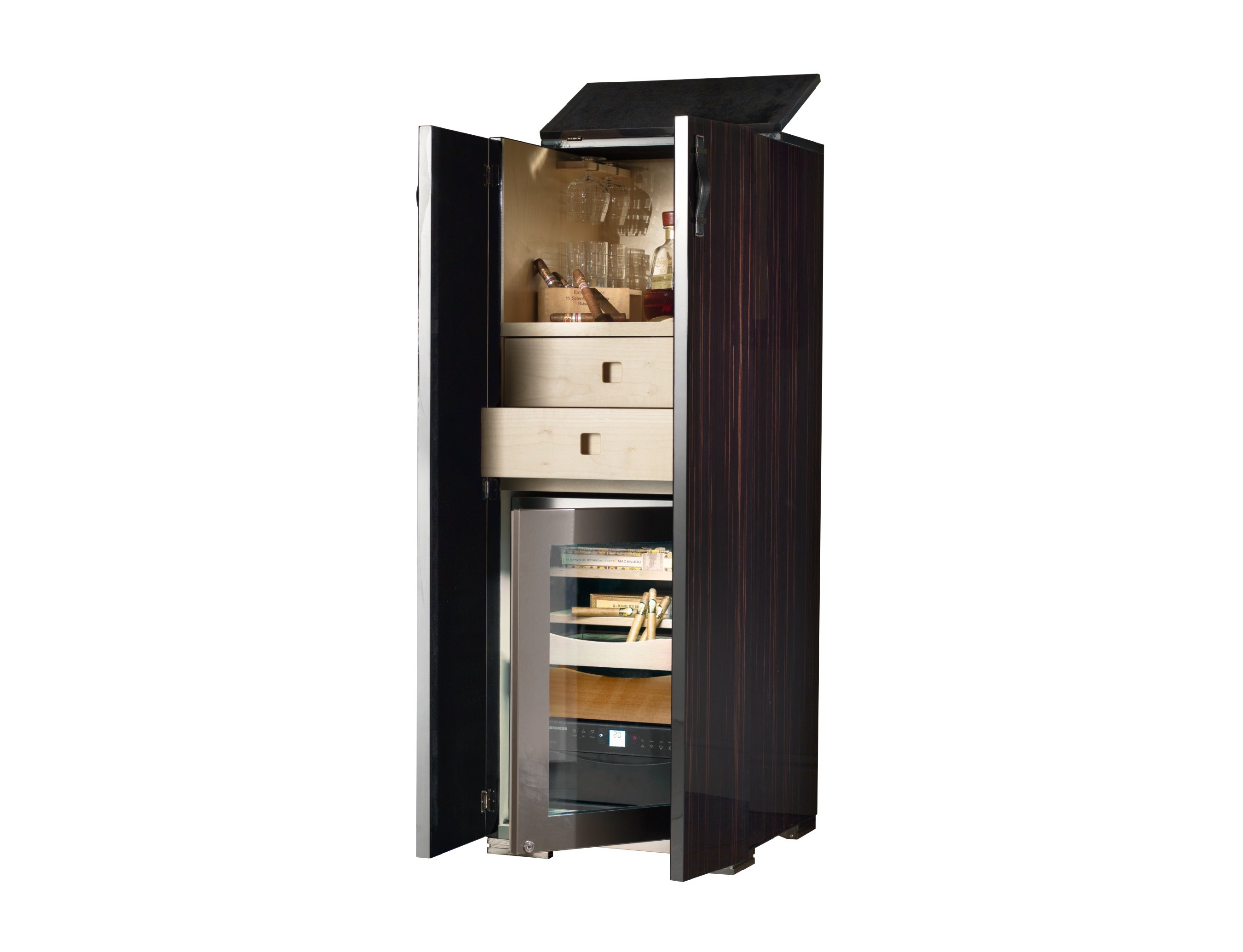 Шкаф полированный из эбенового дерева с двумя дверками и крышкой. Ручки кожаные. Детали выполнены из отделанной рутением латуни. Содержит: электронный увлажнитель LIEBHERR для 500 сигар, 4 бокала для коньяка и 4 хрустальных бокала для Whisky, ручная гравировка, 24% свинец. Фишки для покера, игральные карты, кости и кожаные стаканы. Внутри он выполнен из клёна.