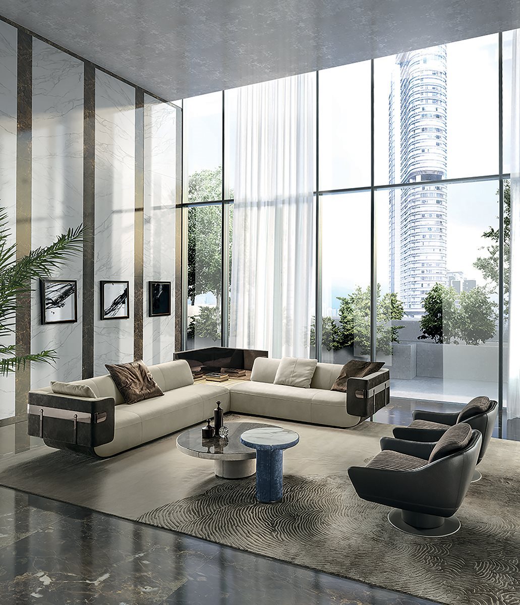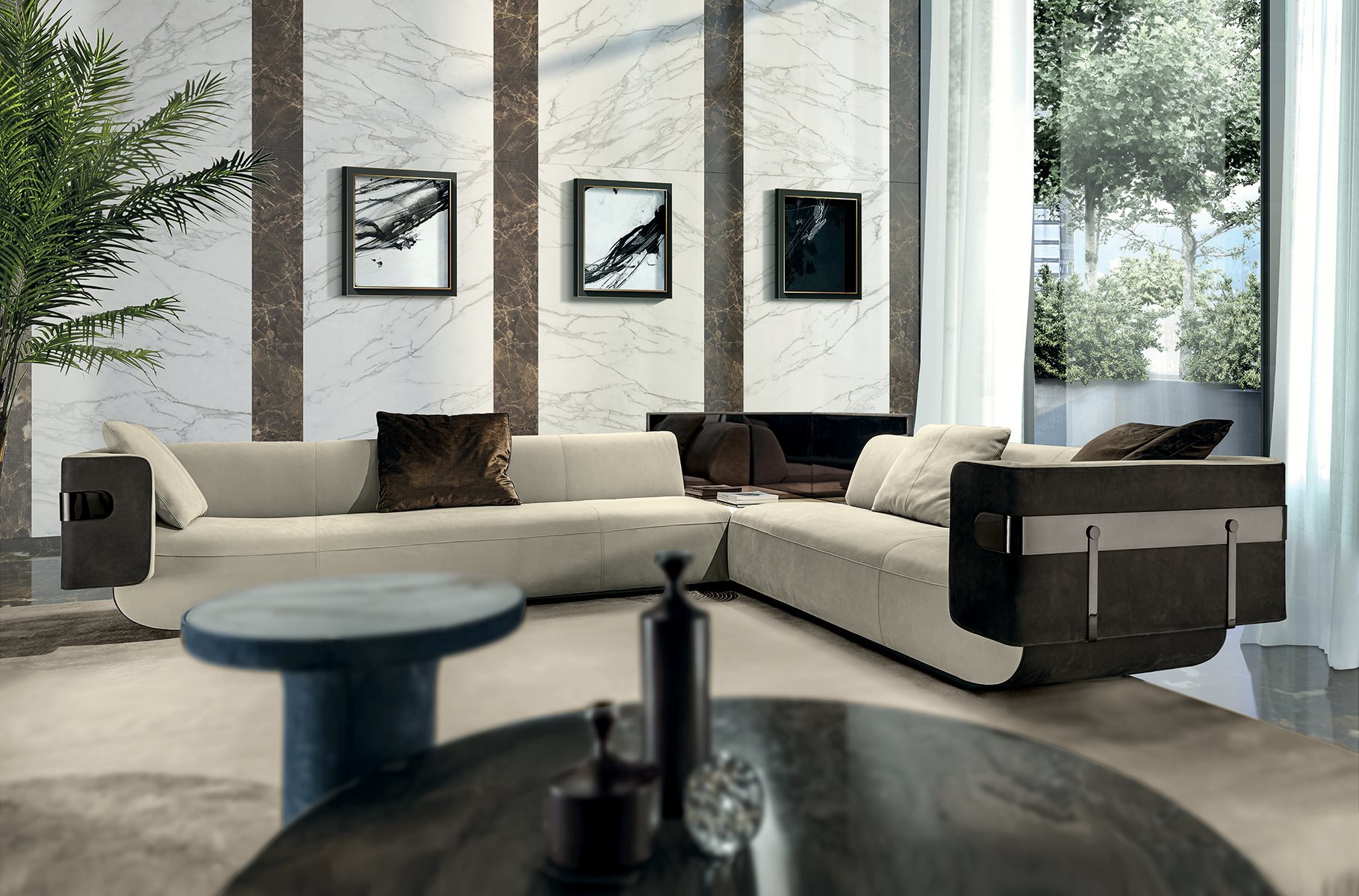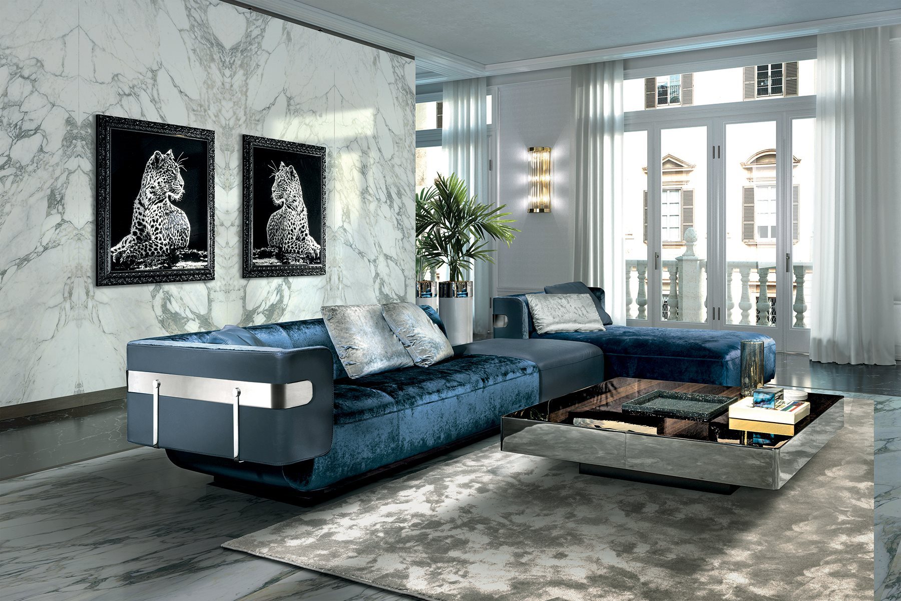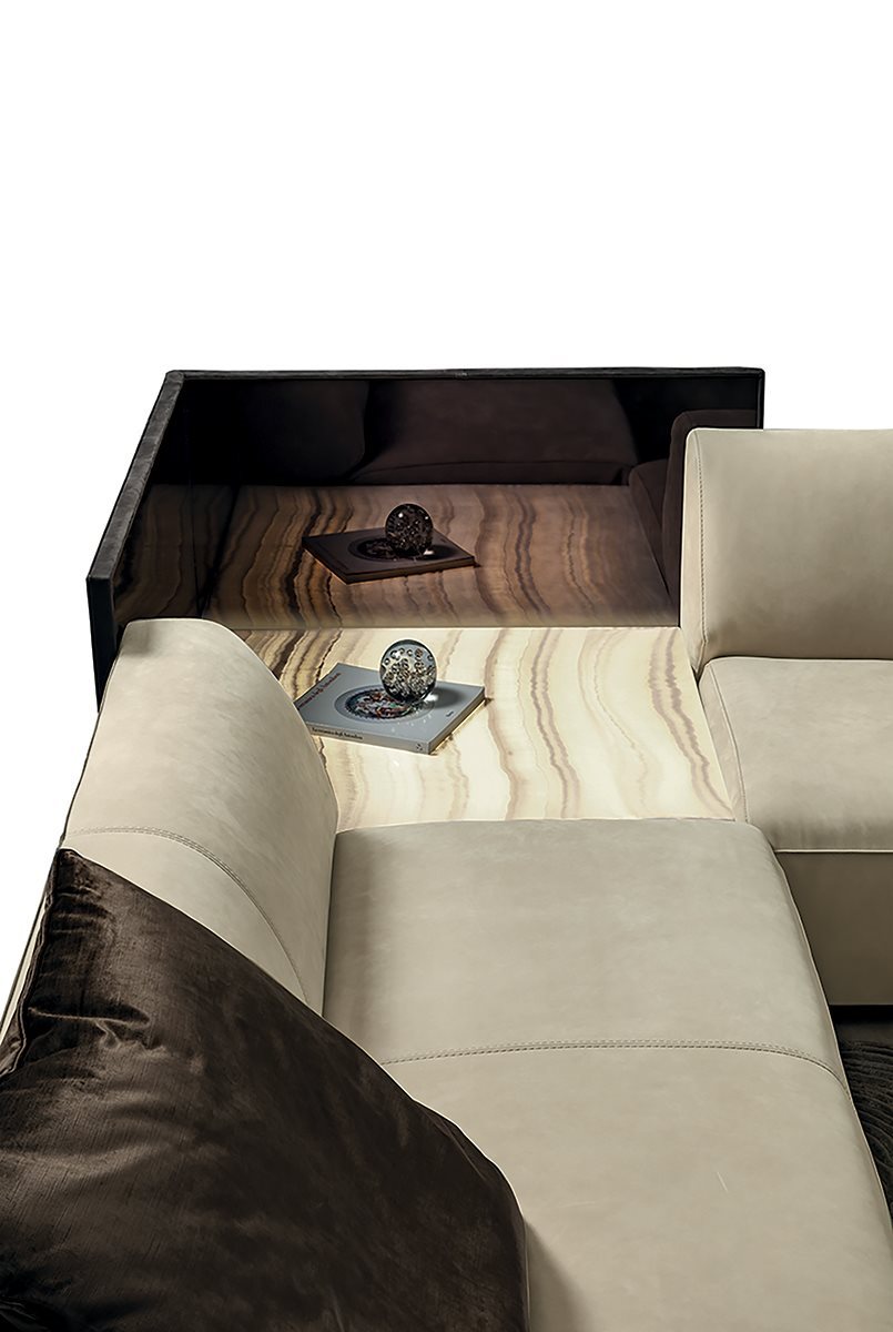 Longhi Угловой журнальный столик в коллекции MI имеет деревянную раму, покрытую тонким слоем пенополиуретана, внешняя сторона покрыта в цвете с диваном, а внутренняя панель доступна в различных вариантах отделки: - металл в гальванической отделке, согласованной с диваном, - бронзовое или дымчатое зеркало, - покрыто кожа согласуется с диваном или в других образцовых шкурах. Столешница журнального столика выполнена из мрамора образца или из оникса или Патагонского мрамора с подсветкой.