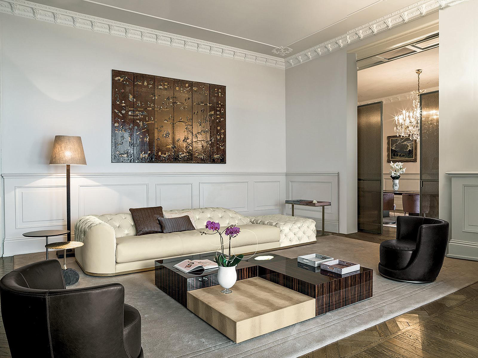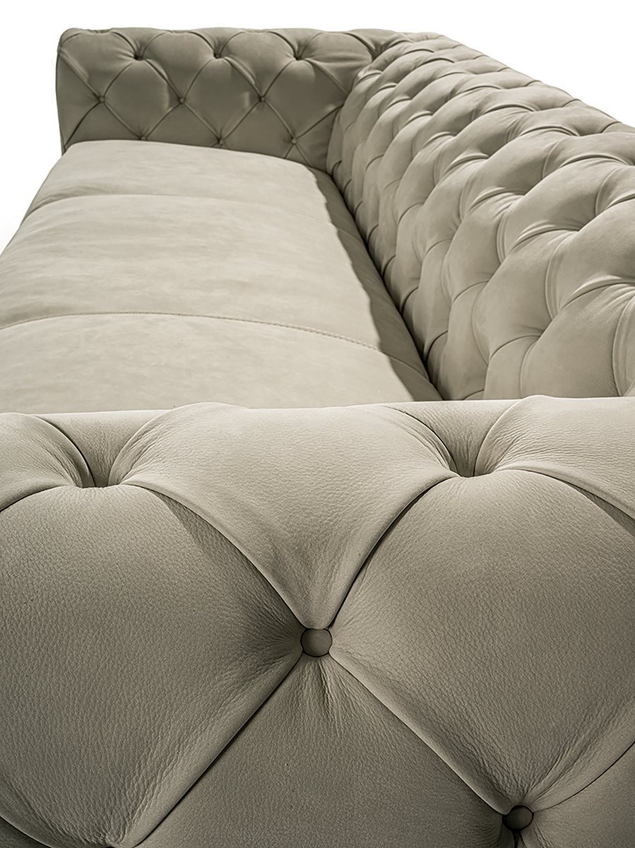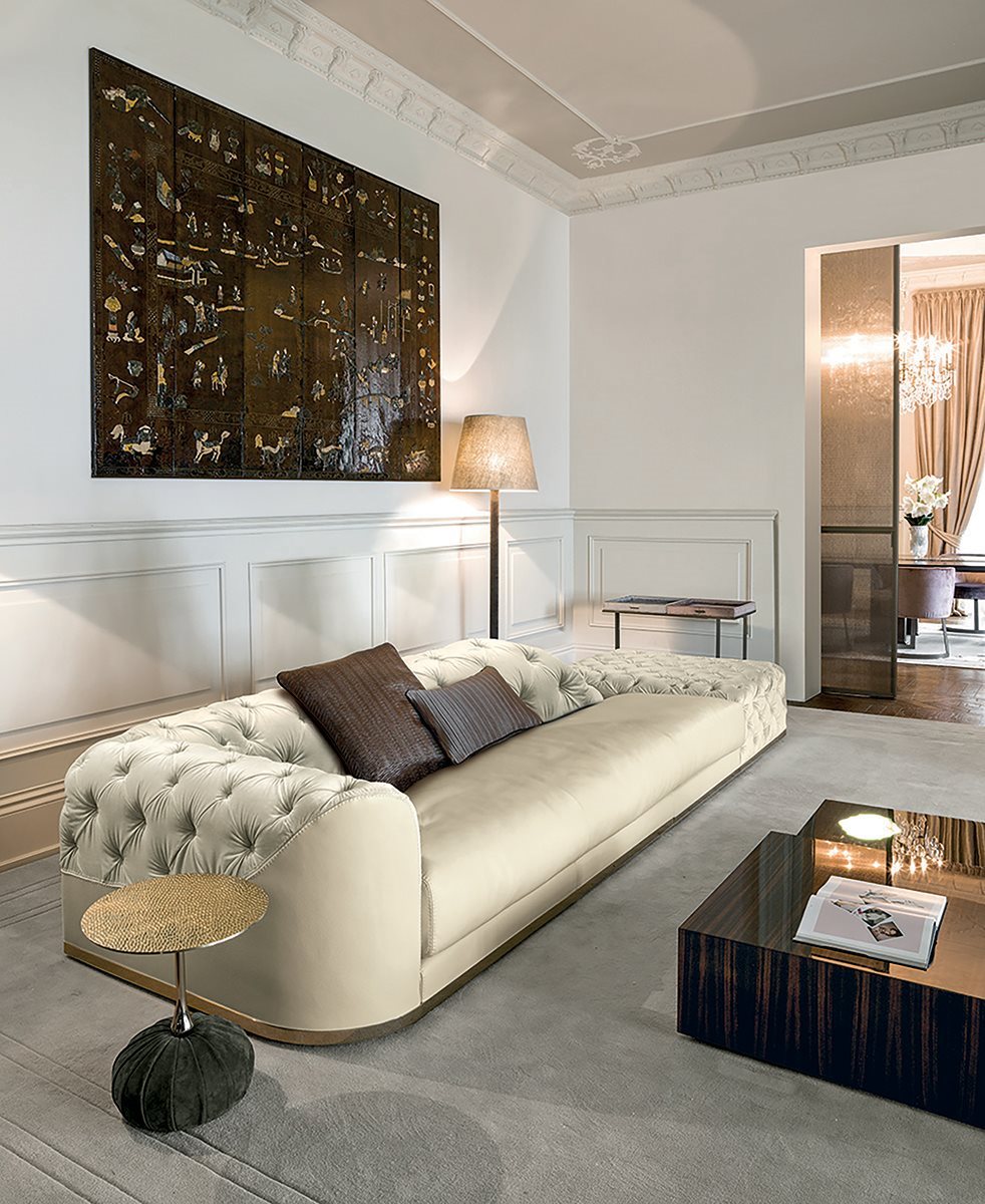 Longhi Благодаря плотной капитонной обработке спинки, смешанной с гладким цельным сиденьем, диван Milton уже с первого взгляда передает свою способность привлекать взгляд и играть роль цельного объекта с сильной индивидуальностью. Его очарование проистекает из элегантного стегания и дизайна с округлыми и мягкими линиями, которые делают его одновременно актуальным, традиционным и необычным.