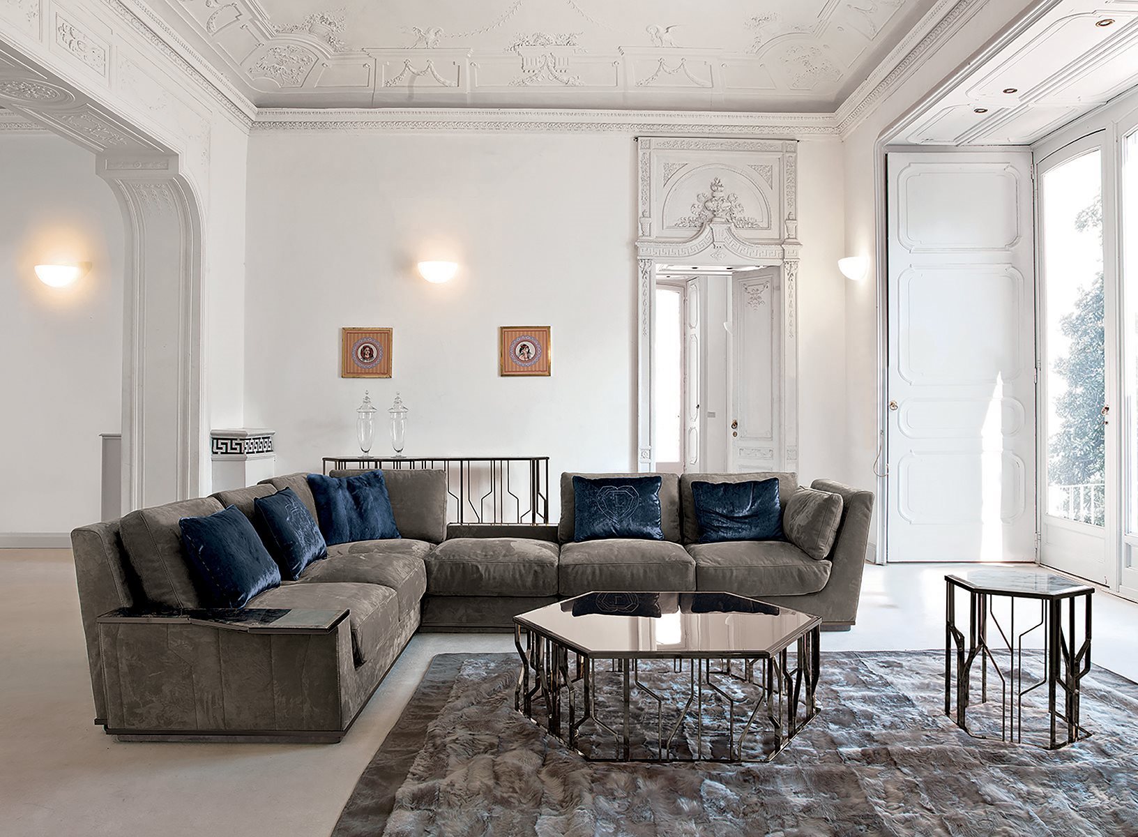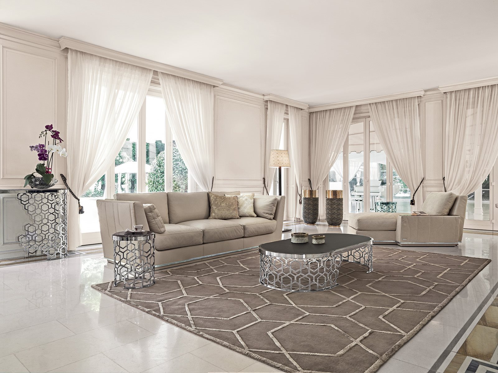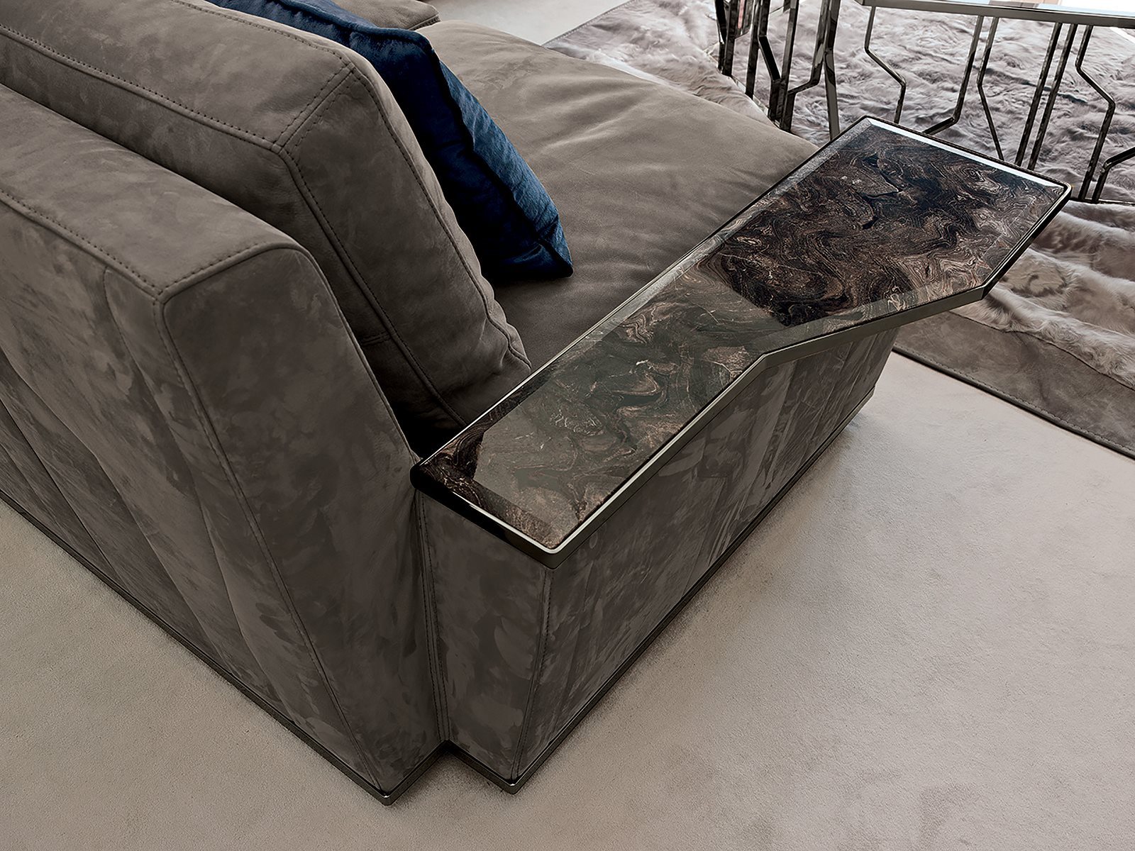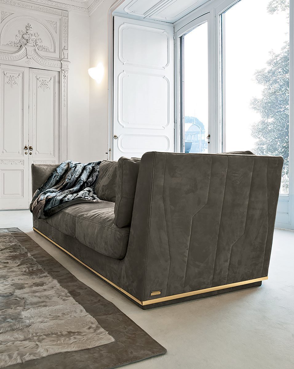 Longhi Превосходство коллекции Loveluxe, диван Nobu имеет иконографически отличительные признаки коллекции уникальных предметов интерьера: отмеченные линии, пришитые к внешней оболочке, возвращают в память металлическую структуру столов, журнальных столиков и консолей Ginza. Секционный и линейный диван, с довольно строгим дизайном, но богатым внешним видом. Крепко опираясь на землю на металлическую опору, он имеет высокую спинку, как подлокотники, которые расширяются, слегка раскрываясь в виде лепестка. Обильные подушки, с которыми можно дополнить композицию, которая может играть на цветах многих сложных тканей, доступных.