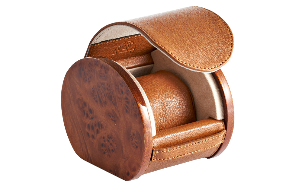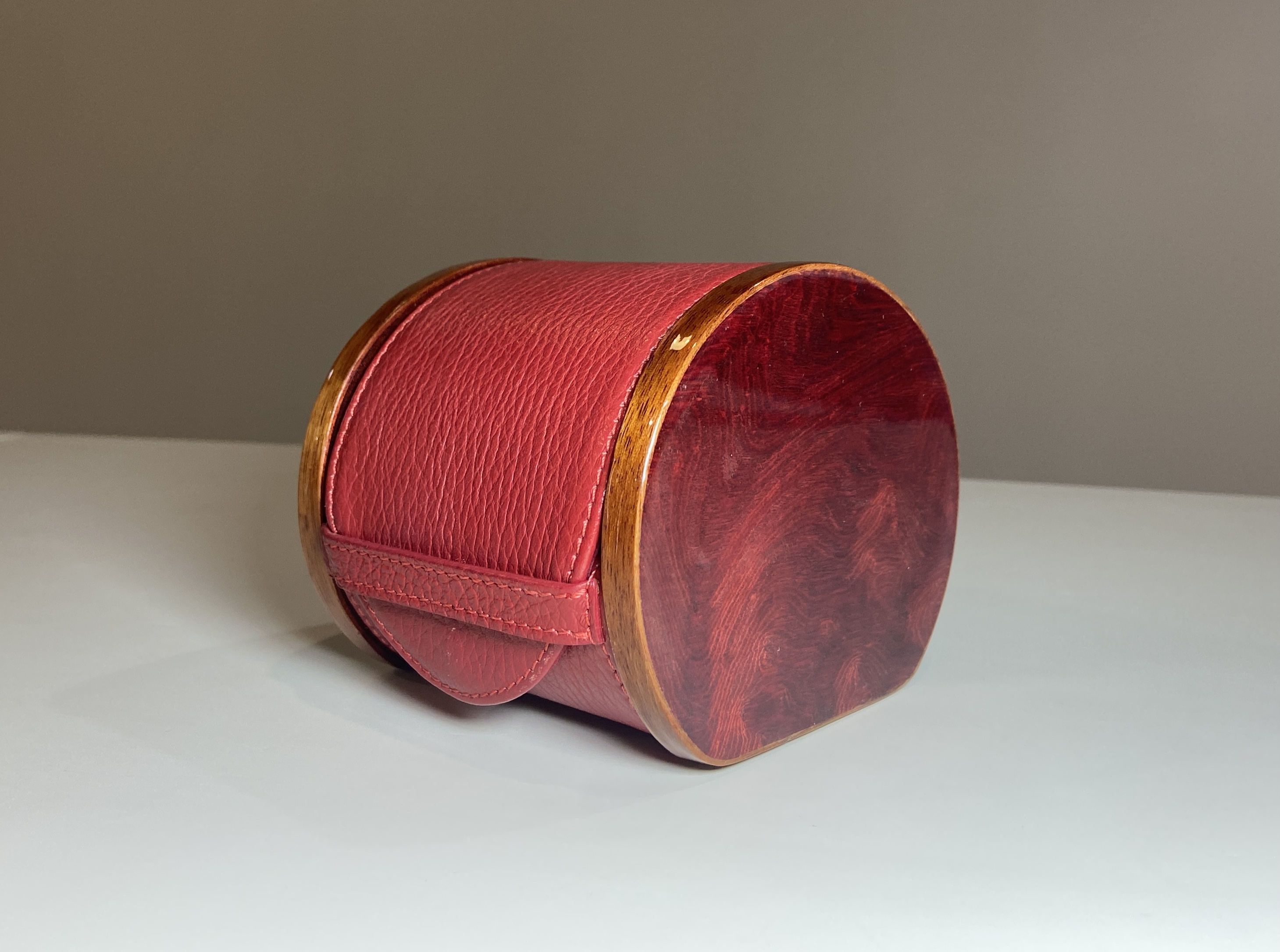 Футляр для часов из телячьей кожи,боковые части из полированного корня вяза красного цвета. Внутренний держатель для часов любого размера. 9x11x9h cm