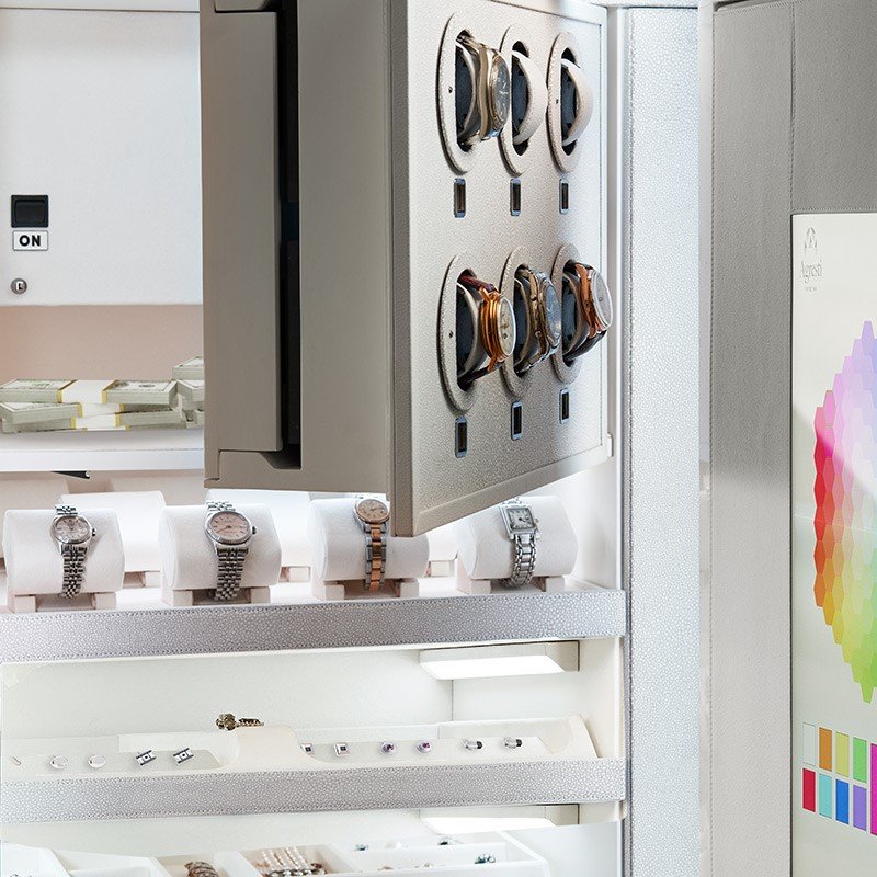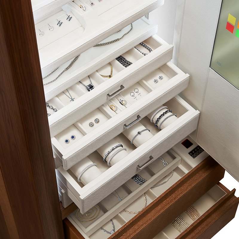 Интерактивный шкаф из орехового дерева Каналетто матовой отделки или из полированного эбенового дерева. Ключ для аварийного открывания. Внутренняя отделка сейфа белой кожей, 6 механизмов для подзарядки автоматических часов. Механизмы полностью изготовлены в Швейцарии. Секретное отделение. Аксессуары выполнены из покрытой рутением латуни. -открытие с помощью сканера отпечатков пальцев и распознавание лиц. -управление доступом пользователей с различными комбинациями. -внутренние RGB светодиоды, регулировка цвета. -регистрация изображений с отправкой на выделенный сервер. -принудительный код, активирующий предварительно закодированный сигнал тревоги. -источник бесперебойного питания, возможность удаленного доступа. РАЗМЕРЫ ШКАФА cm. 63x50x181
