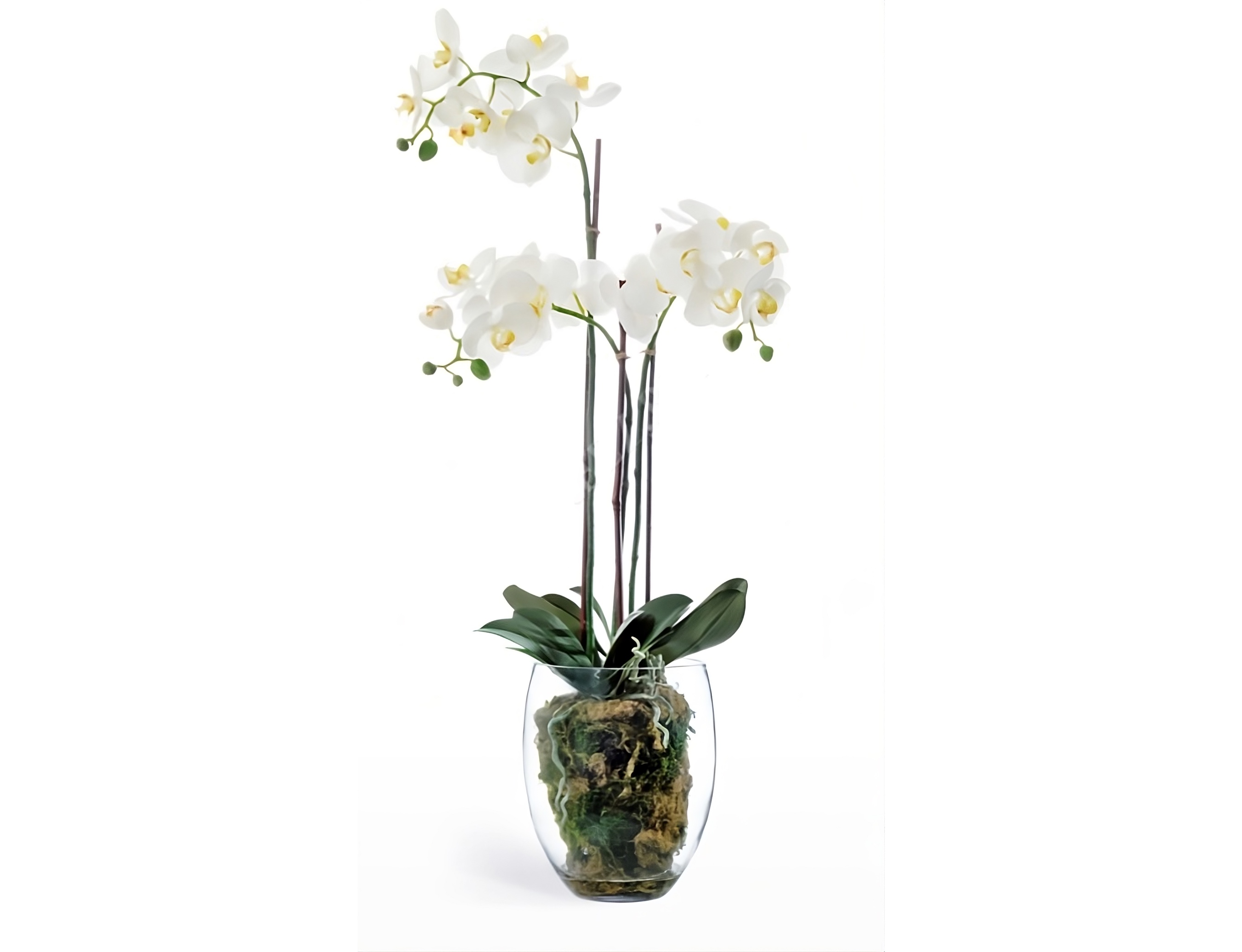 Орхидея Фаленопсис, белая с мхом, корнями. Высота 850 мм.