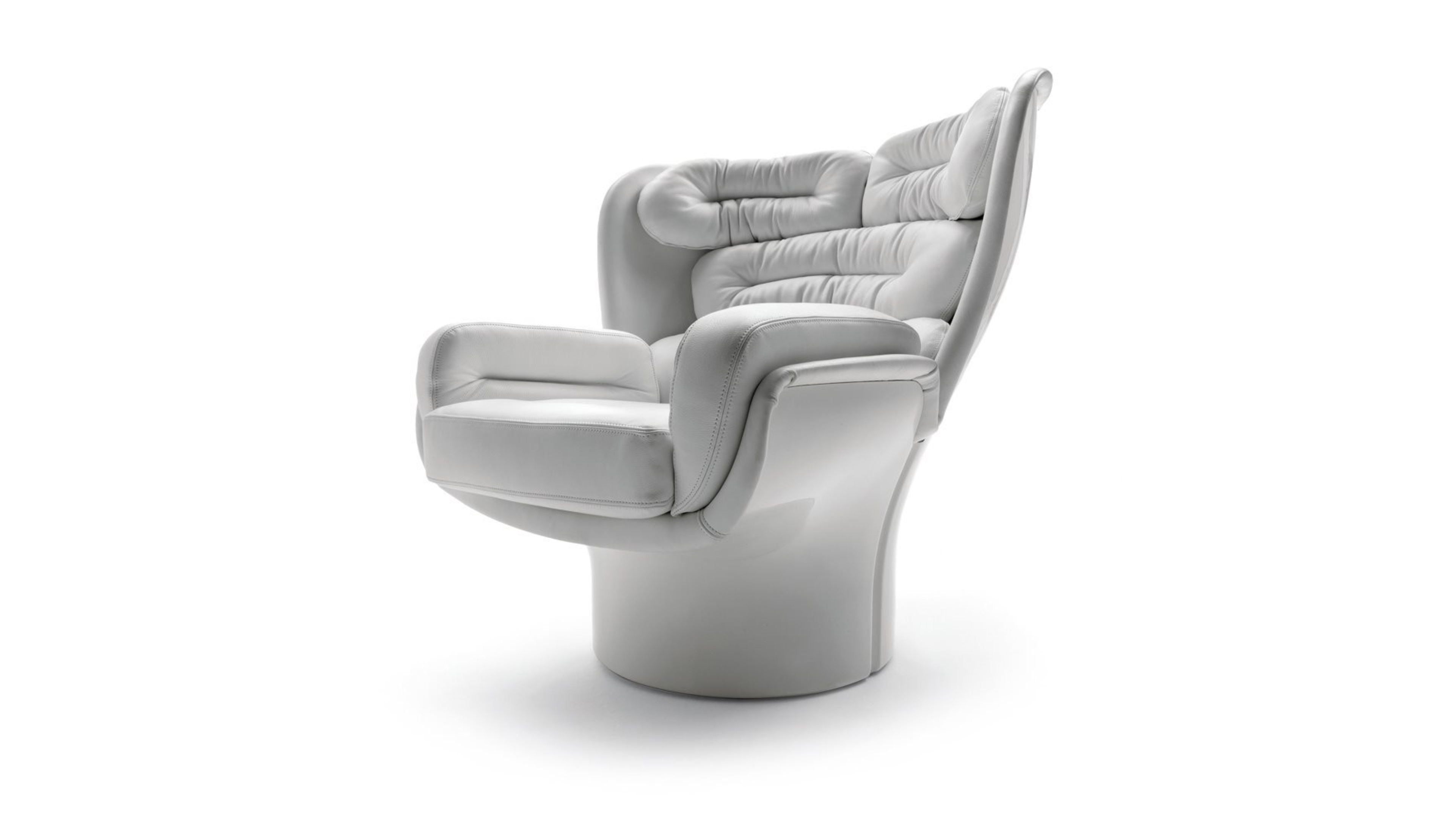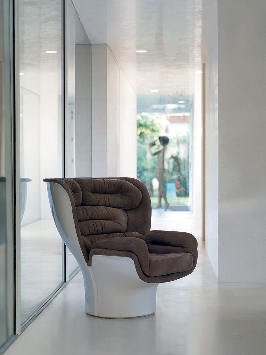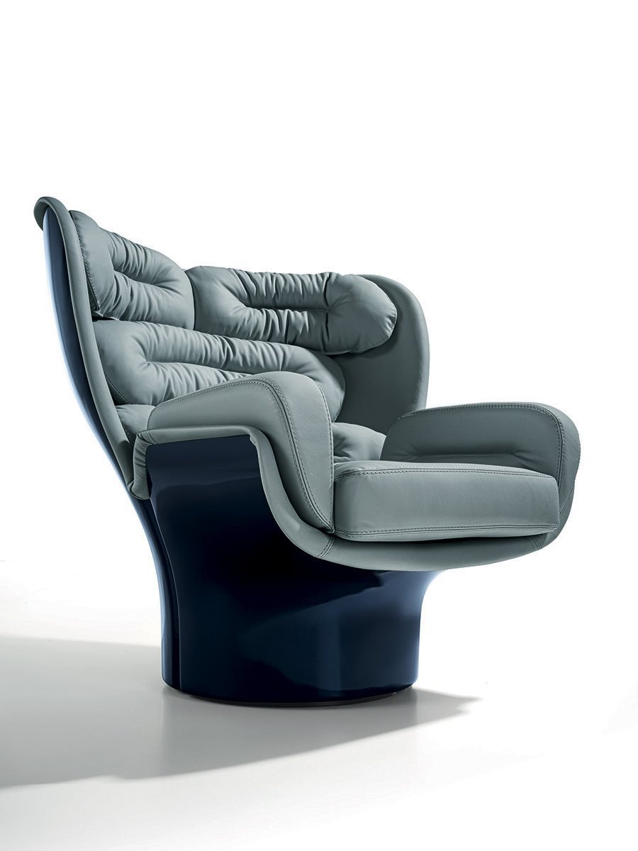 Longhi Elda Футуристический дизайн для наблюдателей 1960-х/70-х годов. Создавая кресло Elda, Коломбо достиг оригинального синтеза между американским и скандинавским мебельным дизайном 1950-х годов и классикой 1930-х годов, в котором смешались футуризм и функционализм. Elda имеет вращающееся круглое основание, на которое насажены две лепестковые оболочки из стекловолокна, обитые изнутри съемными трубчатыми подушками, обтянутыми кожей. Таким образом, кресло становится не просто предметом, а инструментом психофизического благополучия, сочетая уединение, гарантированное высокой спинкой и защитной оболочкой, с комфортом анатомических подушек и функциональностью вращения благодаря скрытым колесикам.