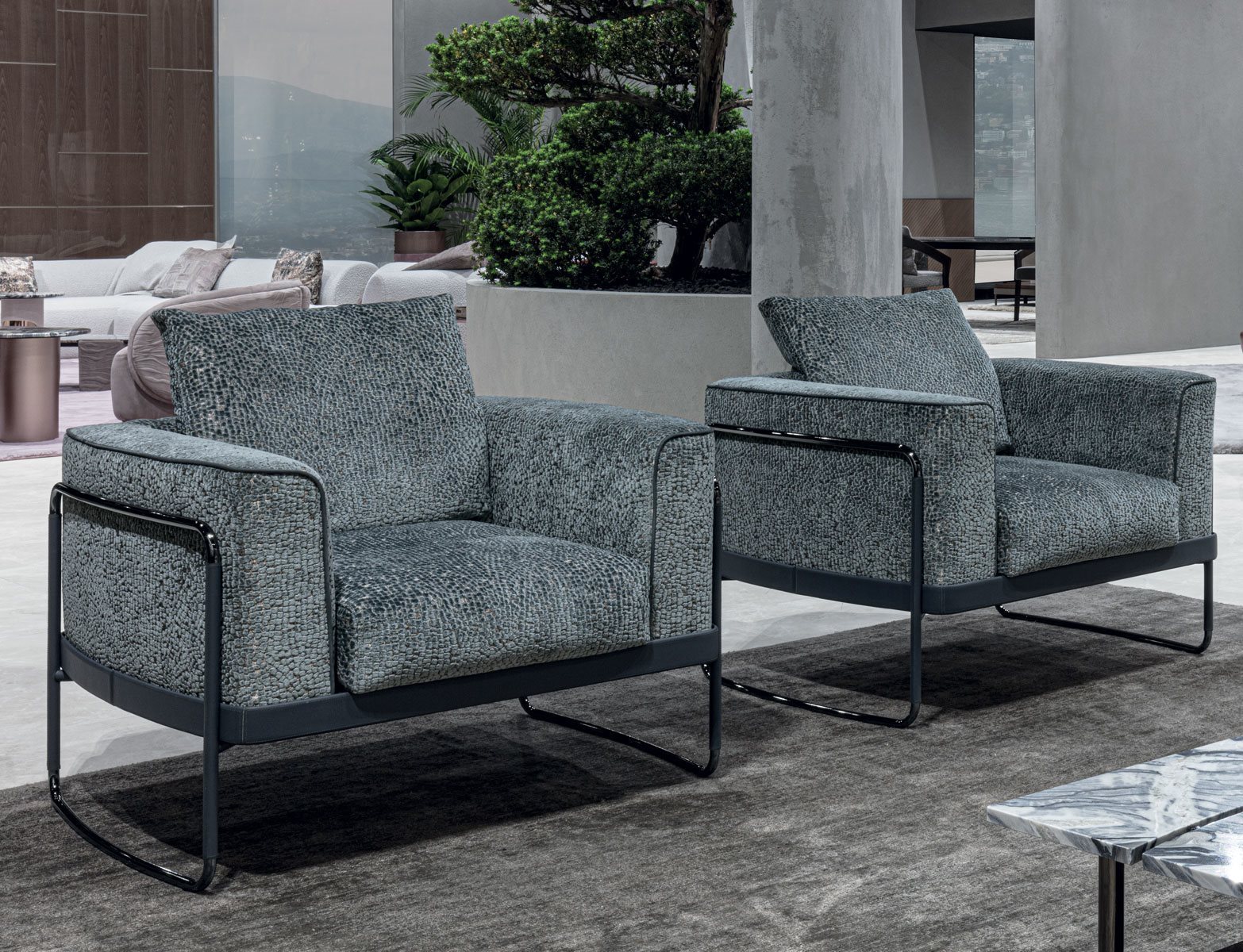 Longhi Кресло характеризуется мягкой структурой с наружными подлокотниками из трубчатого металла с обволакивающей формой, частично покрытой полосой "Renova", особым типом переработанной кожи, экологически устойчивой и антибактериальной, которая соответствует или контрастирует с цветом основной обивки кресла. В основании размещен металлический пояс, тонко покрытый этим новым материалом, напоминающим натуральную кожу, и все это поддерживается прочной металлической структурой. Облицованная конструкция выполнена из дерева, покрытого пенополиуретаном высокой плотности. Подушка сиденья изготовлена из пенополиуретана тройной плотности, покрытого мягким стеганым одеялом из стерилизованного и сертифицированного гусиного пуха. Задняя подушка изготовлена из стерилизованного и сертифицированного гусиного пуха. Открытые трубчатые металлические детали хромированы в отделке: градиентная медь, глянцевый градиент коричневого цвета, черное розовое золото, глянцевое светлое золото, матовое шампанское, глянцевый хром, глянцевый черный хром, матовая атласная бронза. Благодаря особому мастерству конструкция не съемная, а подушка сиденья и спинки съемная.