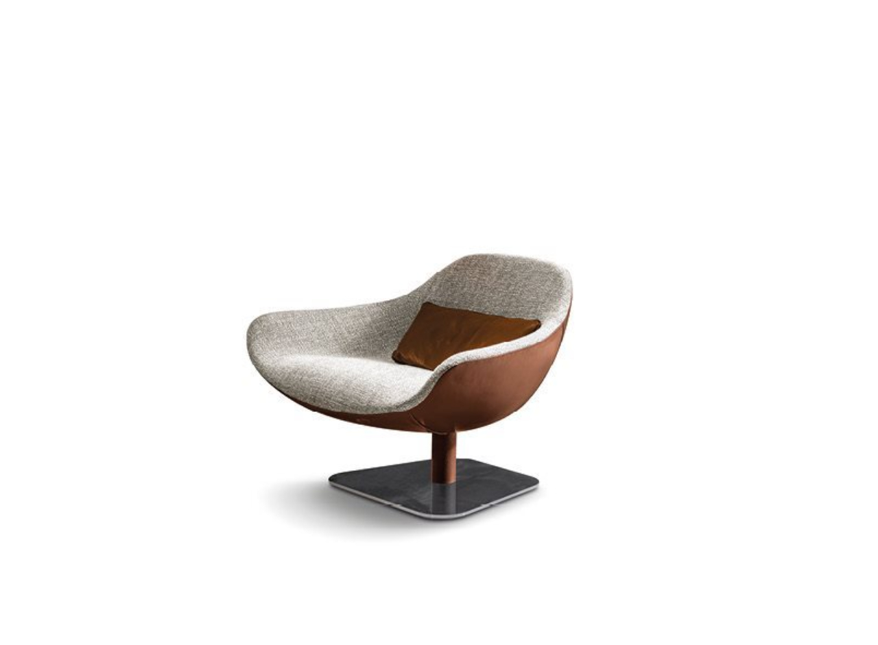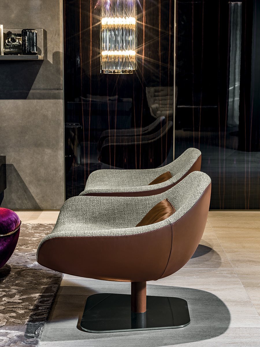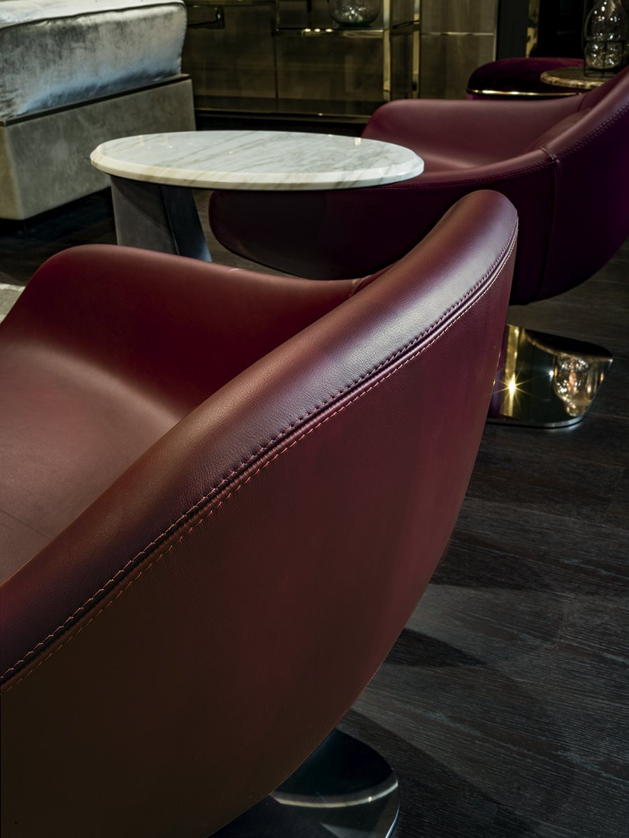 Longhi Форма повторяет старинные линии, актуализируя их с чрезвычайно сложной упаковкой, большой оболочкой из ткани или кожи, чтобы создать текстурную игру большой элегантности. Мередит является результатом большого поиска, чтобы наилучшим образом выразить изощренную простоту упаковки. Основание поворачивается на 360° с самовыравнивающимся механизмом.