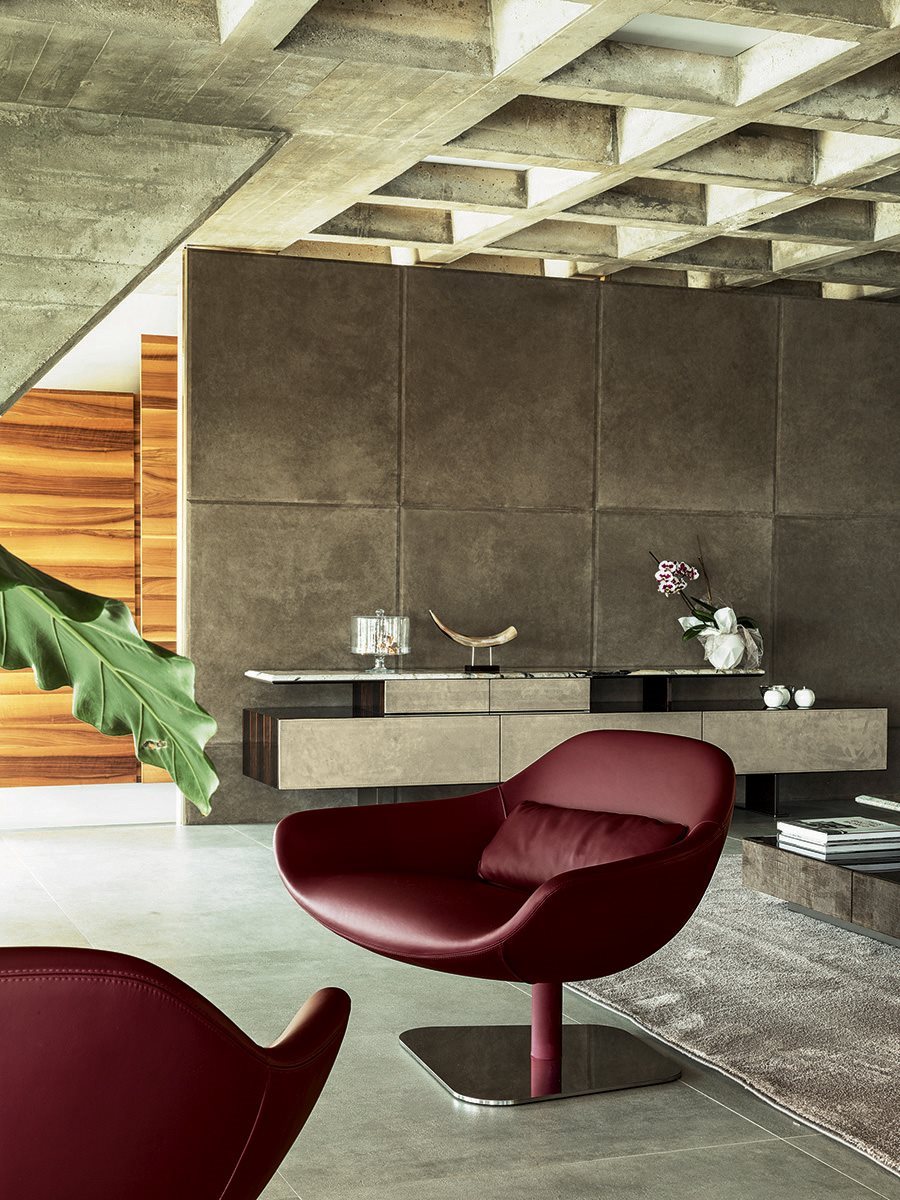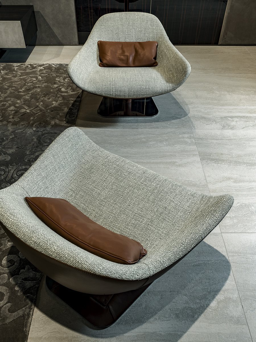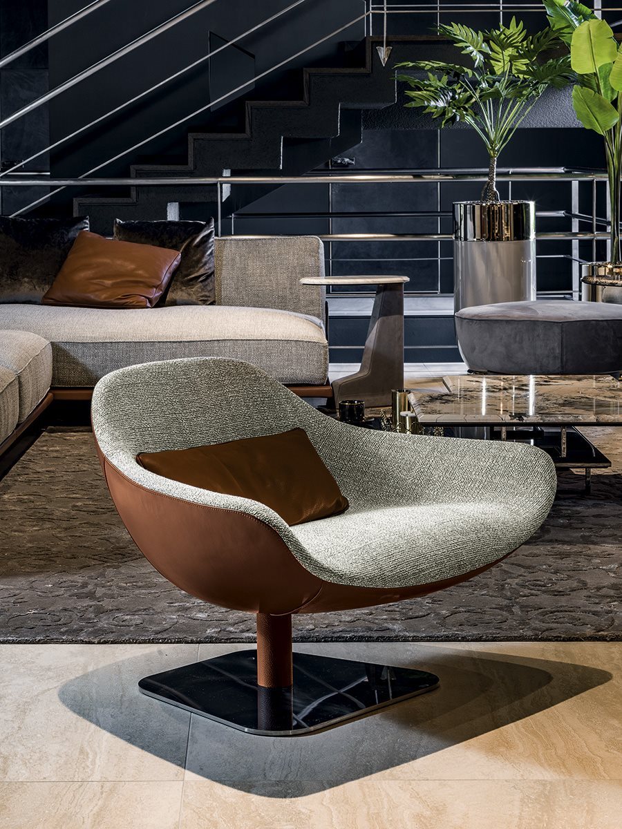 Longhi Форма повторяет старинные линии, актуализируя их с чрезвычайно сложной упаковкой, большой оболочкой из ткани или кожи, чтобы создать текстурную игру большой элегантности. Мередит является результатом большого поиска, чтобы наилучшим образом выразить изощренную простоту упаковки. Основание поворачивается на 360° с самовыравнивающимся механизмом.