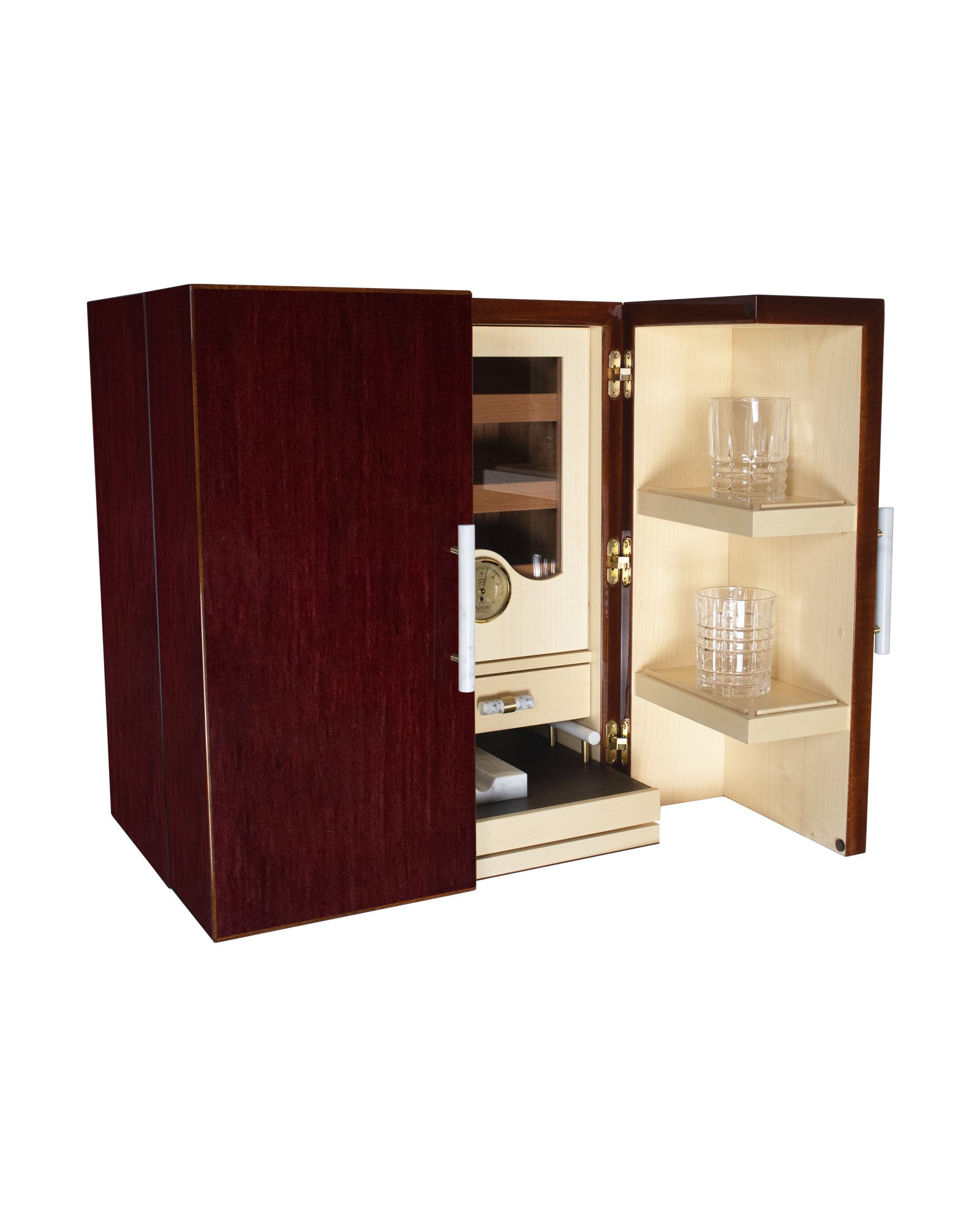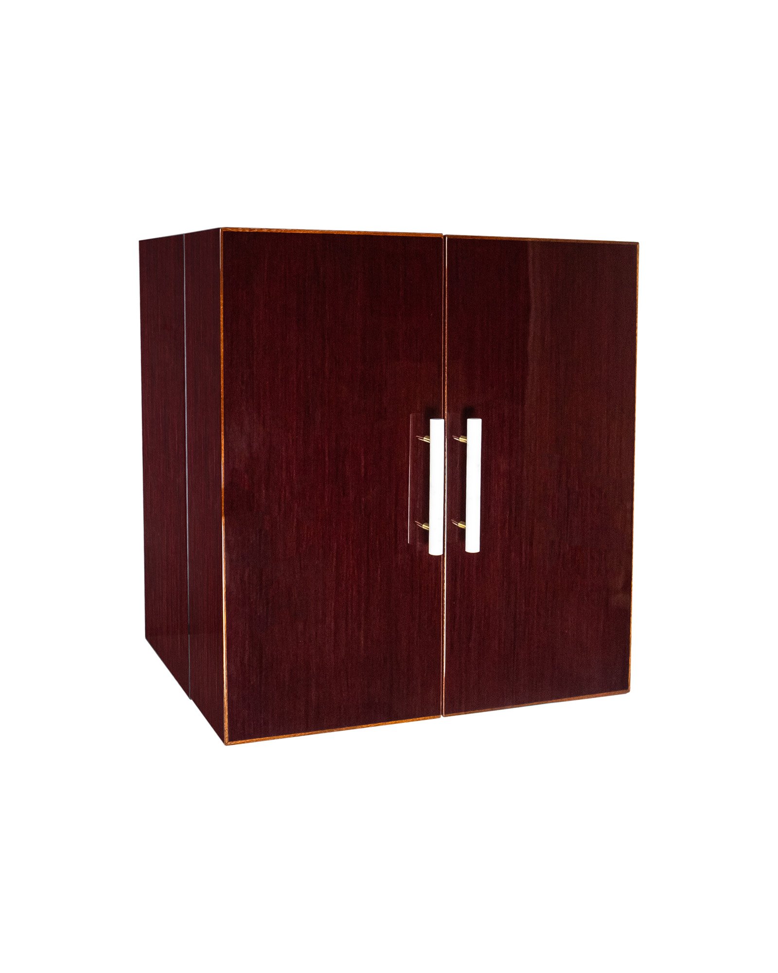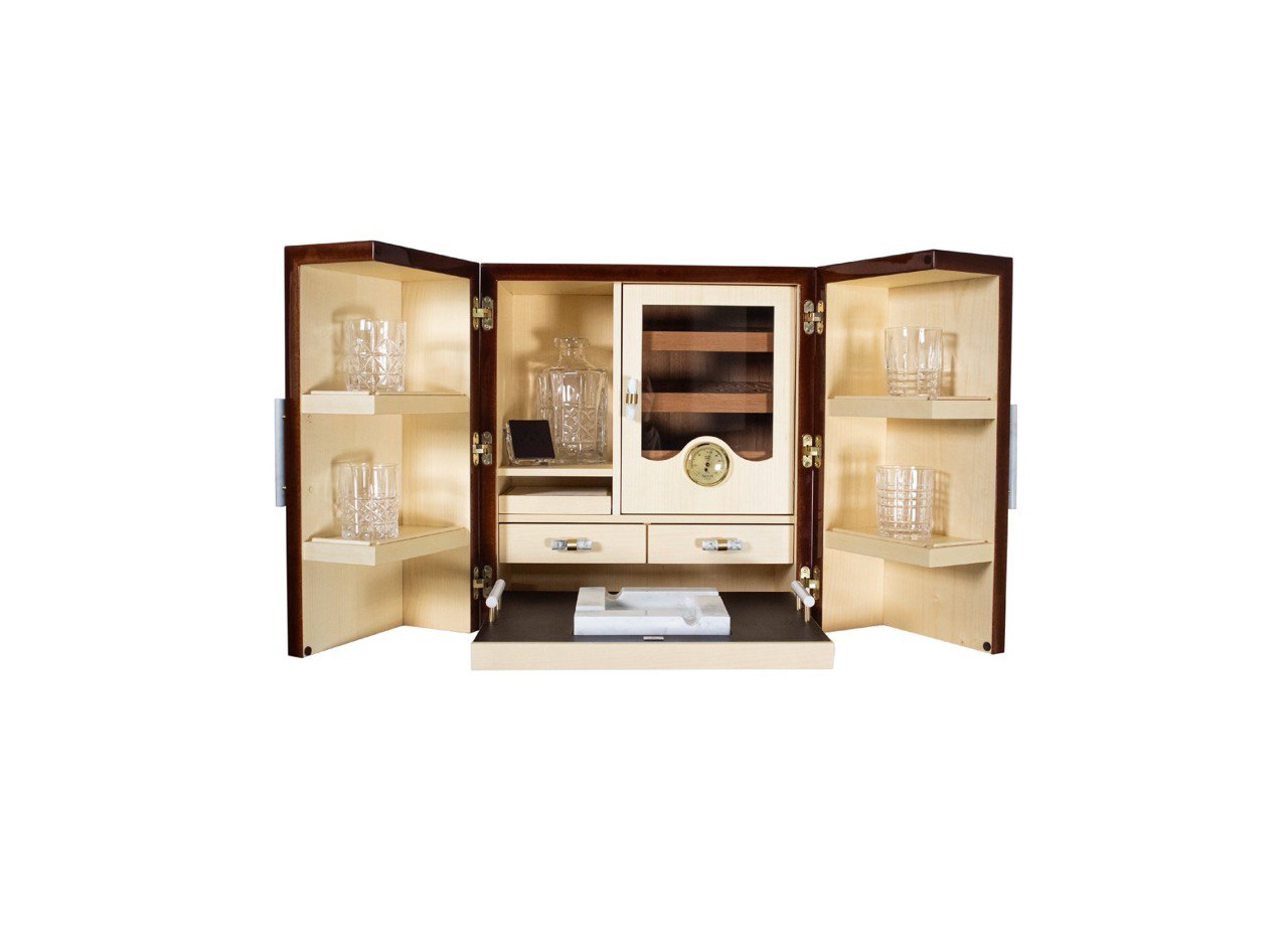 Корпус мини-бара выполнен из красного дуба и красного дерева с блестящей отделкой. Внутри находится хрустальный набор для виски. Увлажнитель воздуха и гигрометр для сигар. Ручки из белого мрамора и матовой латуни. Съемный поднос с пепельницей из белого каррарского мрамора. РАЗМЕРЫ cm. В50 x Ш43 х ГH55