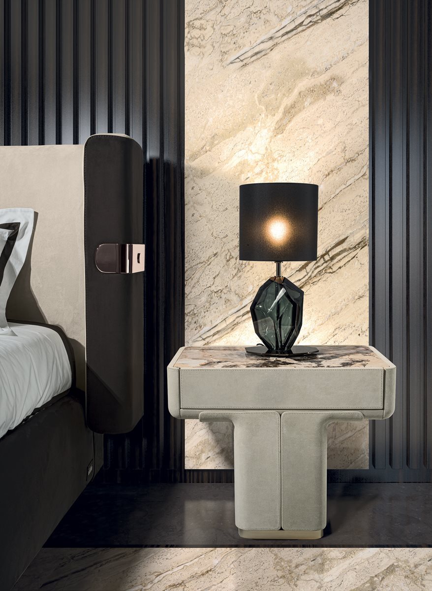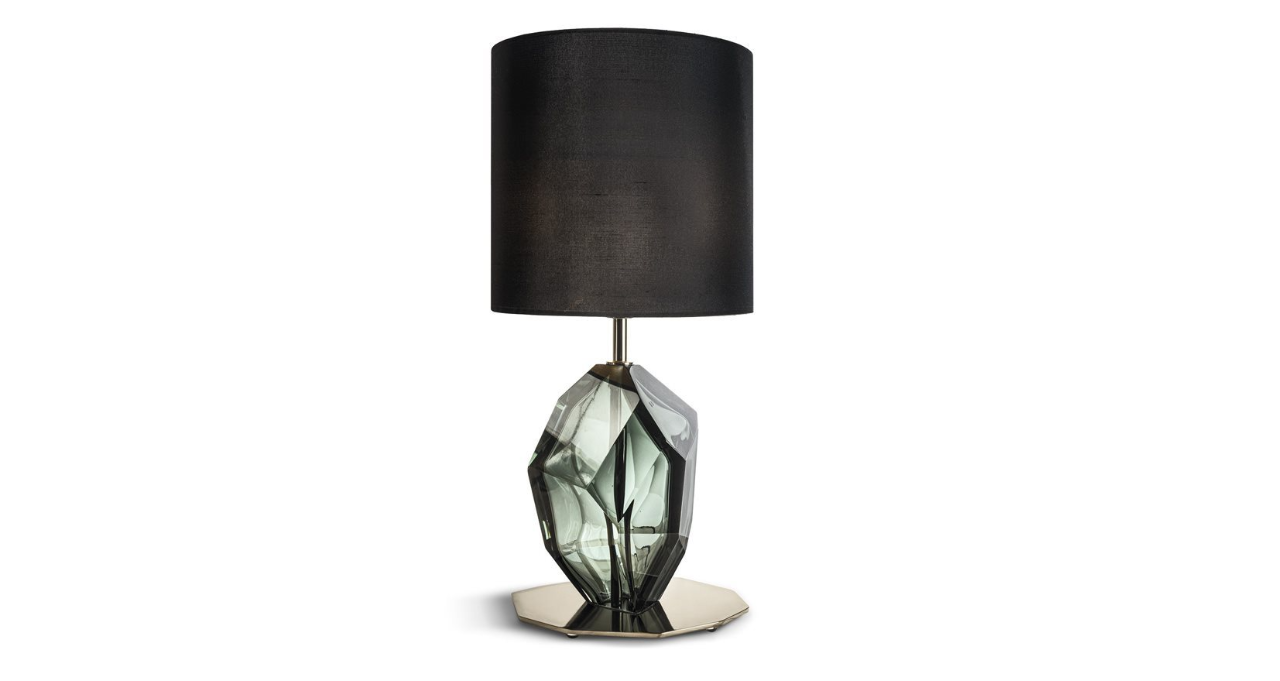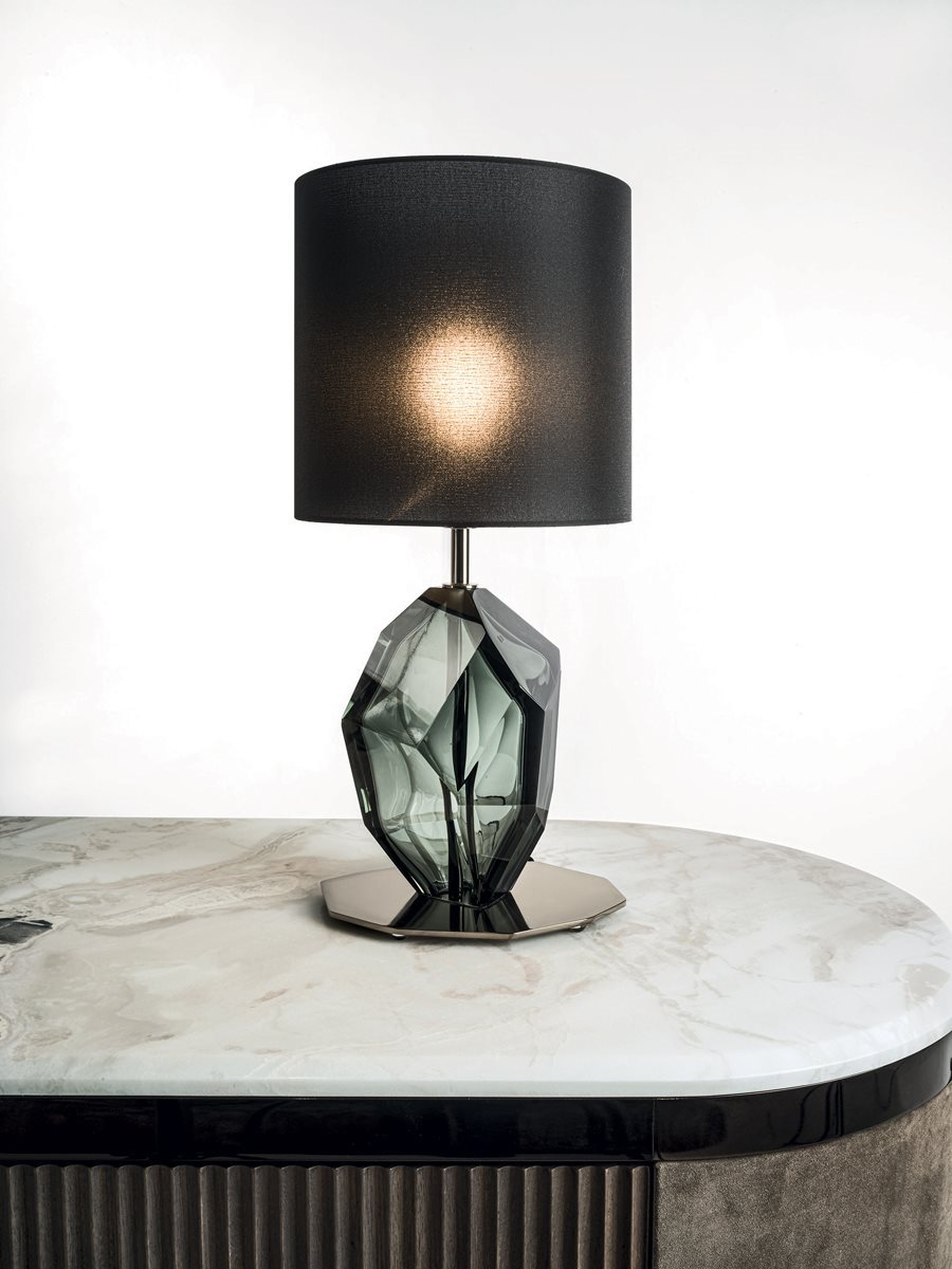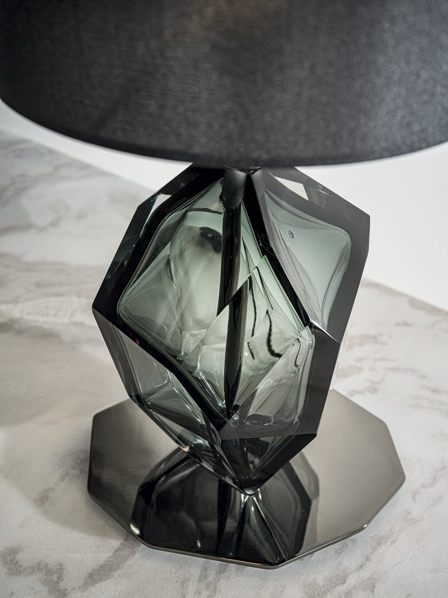 Настольная лампа с подставкой из выдувного и шлифованного вручную стекла, дымчато-серого, янтарного и белого цвета, с металлической рамой в гальванической отделке из светлого золота и черного никеля. Цилиндрический абажур из черной ткани.