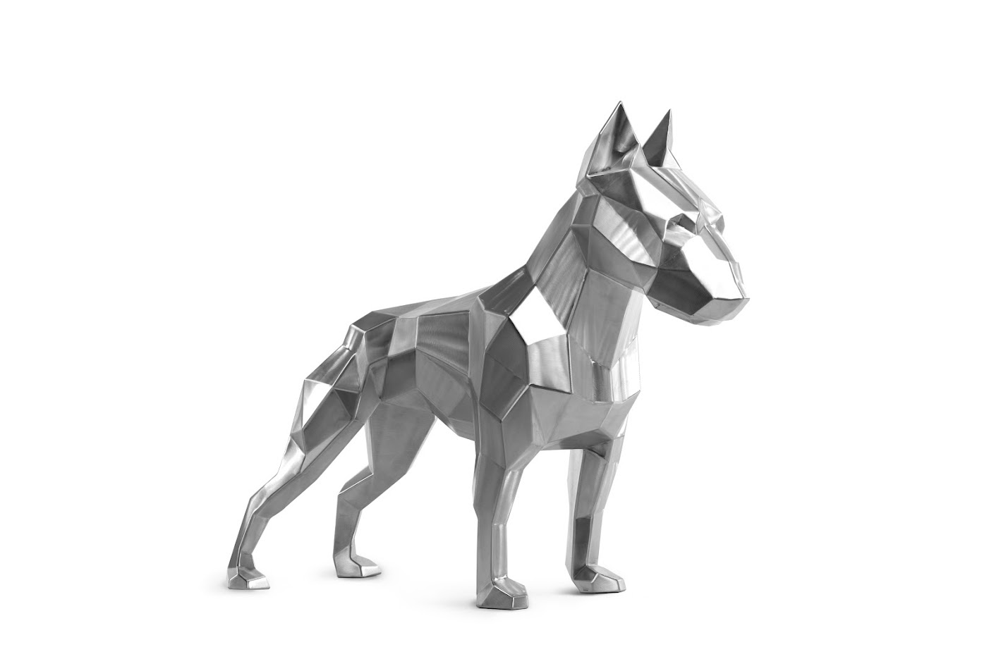Полигональная скульптура «Бультерьер» Размер 87.5 x 50 x 31 см. Доступны к заказу варианты исполнения: Углеродистая сталь в любом цвете по RAL Нержавеющая сталь шлифованная/обоженная Нержавеющая сталь полированная Возможно изменение размеров в индивидуальном заказе.