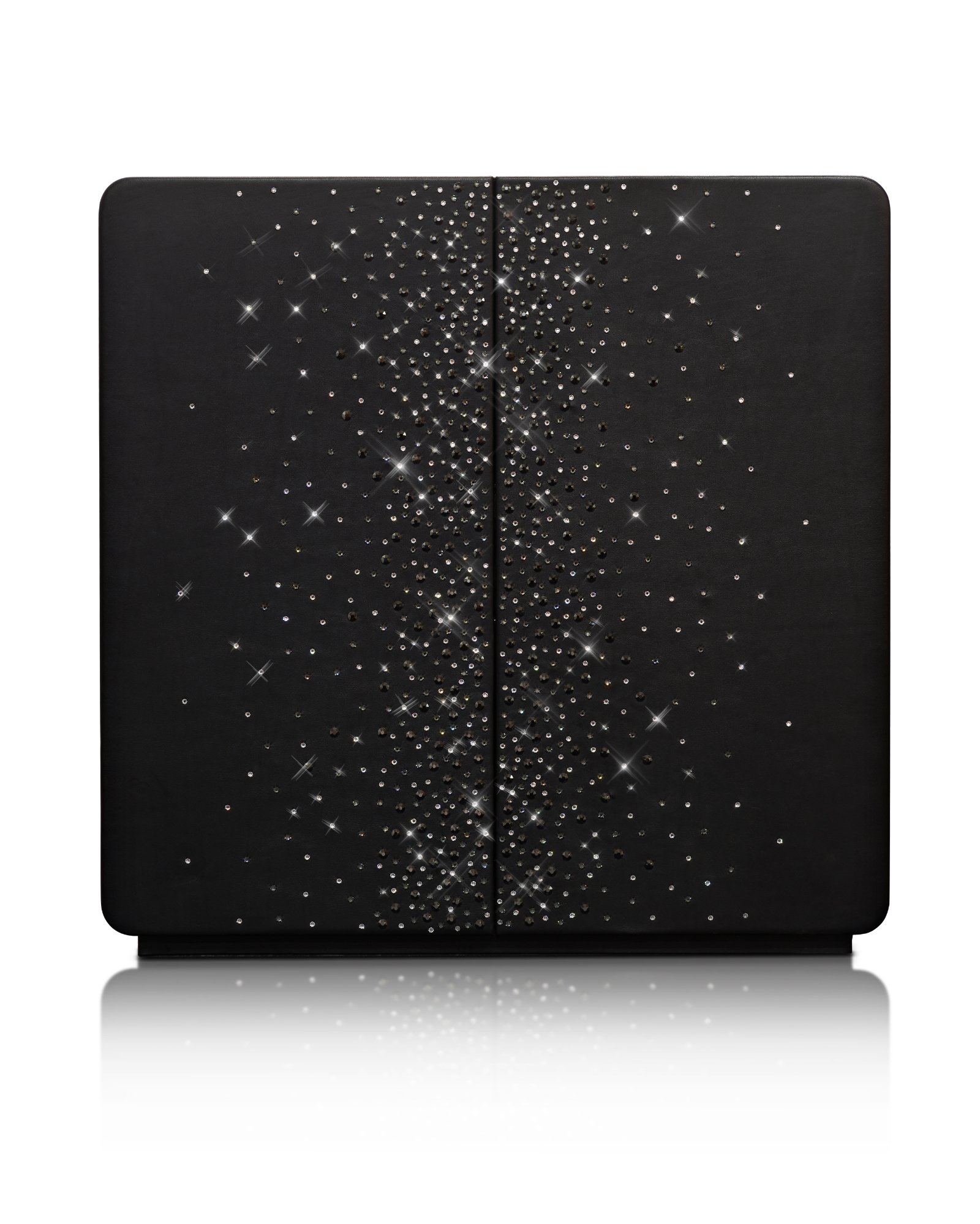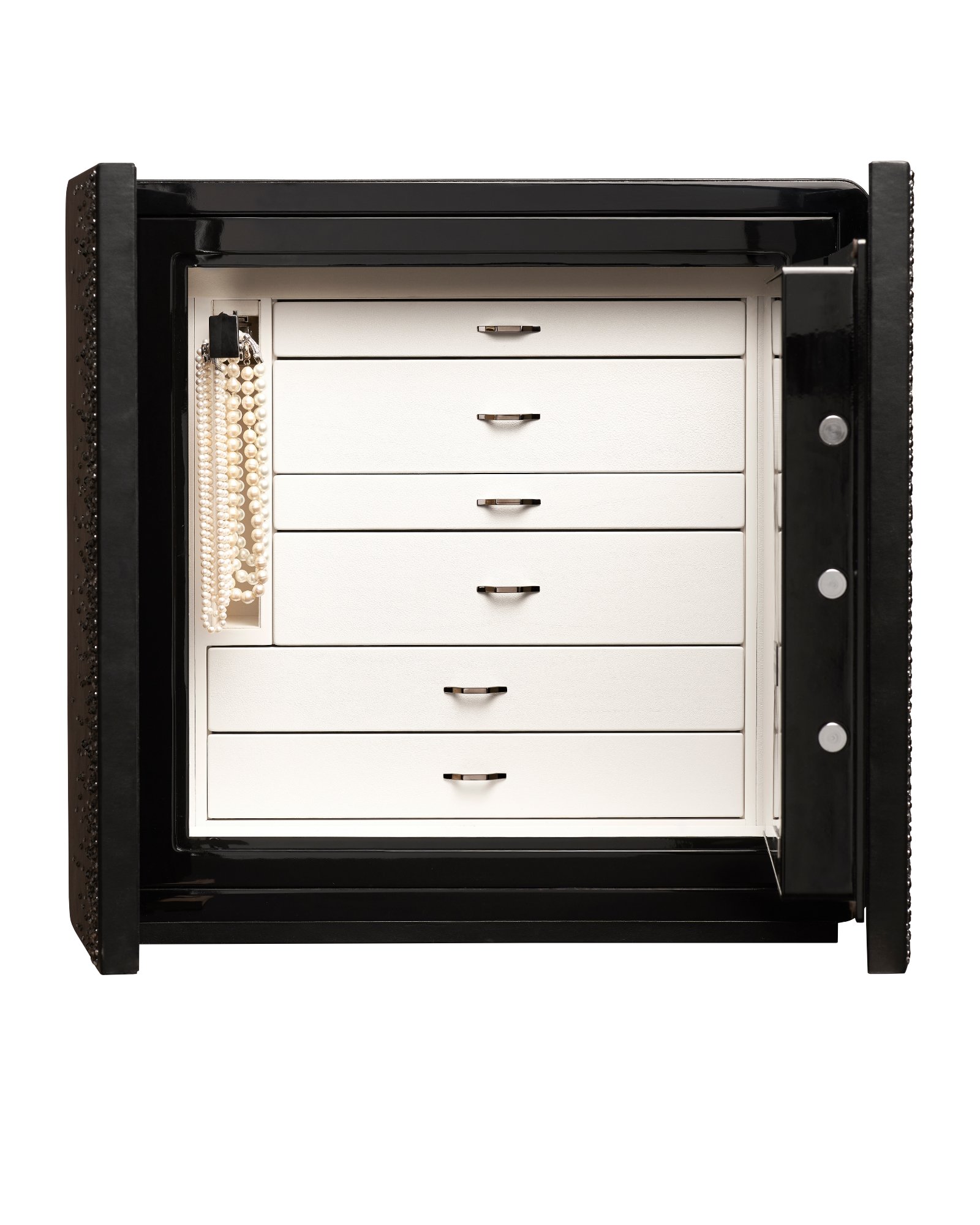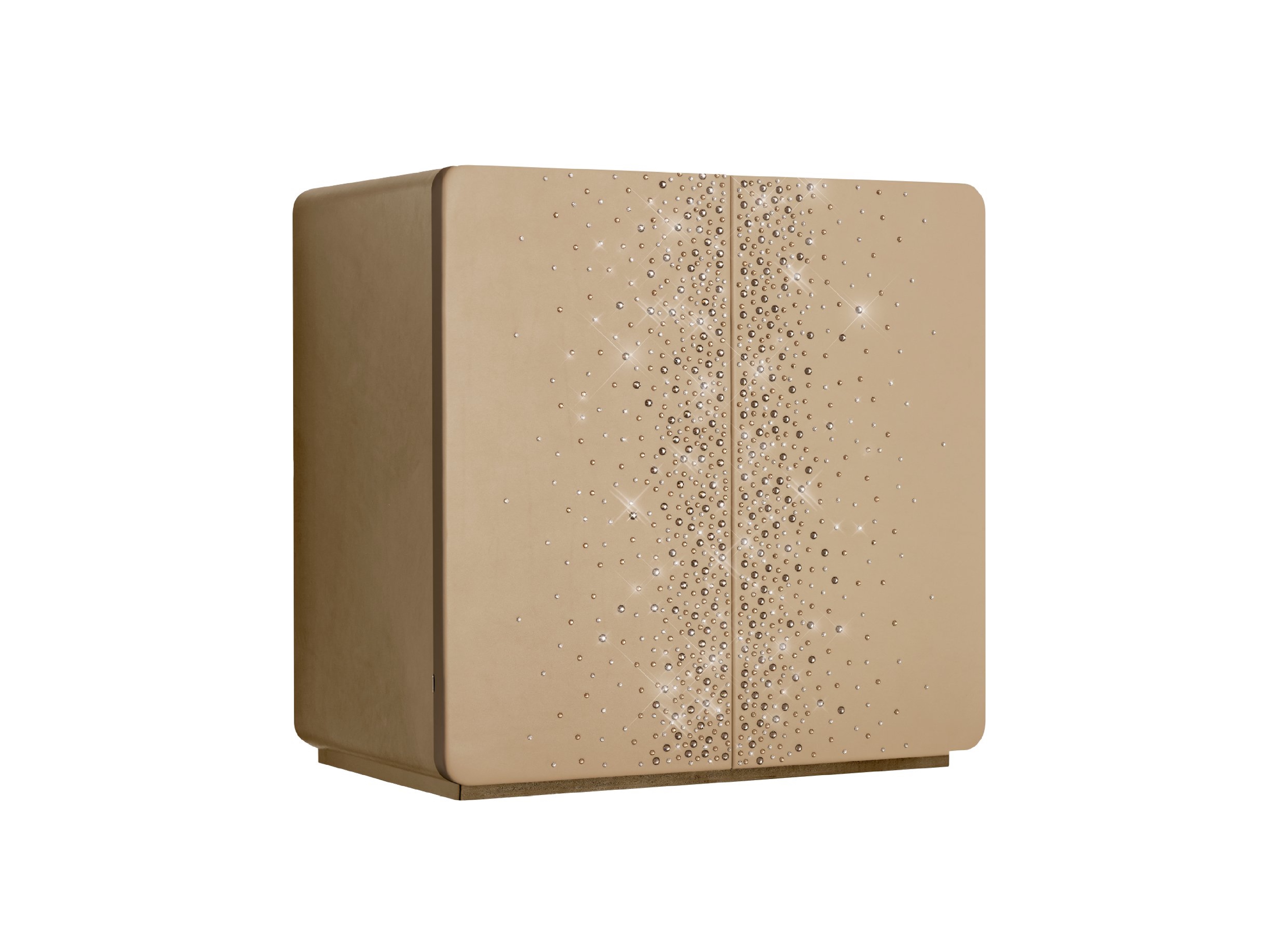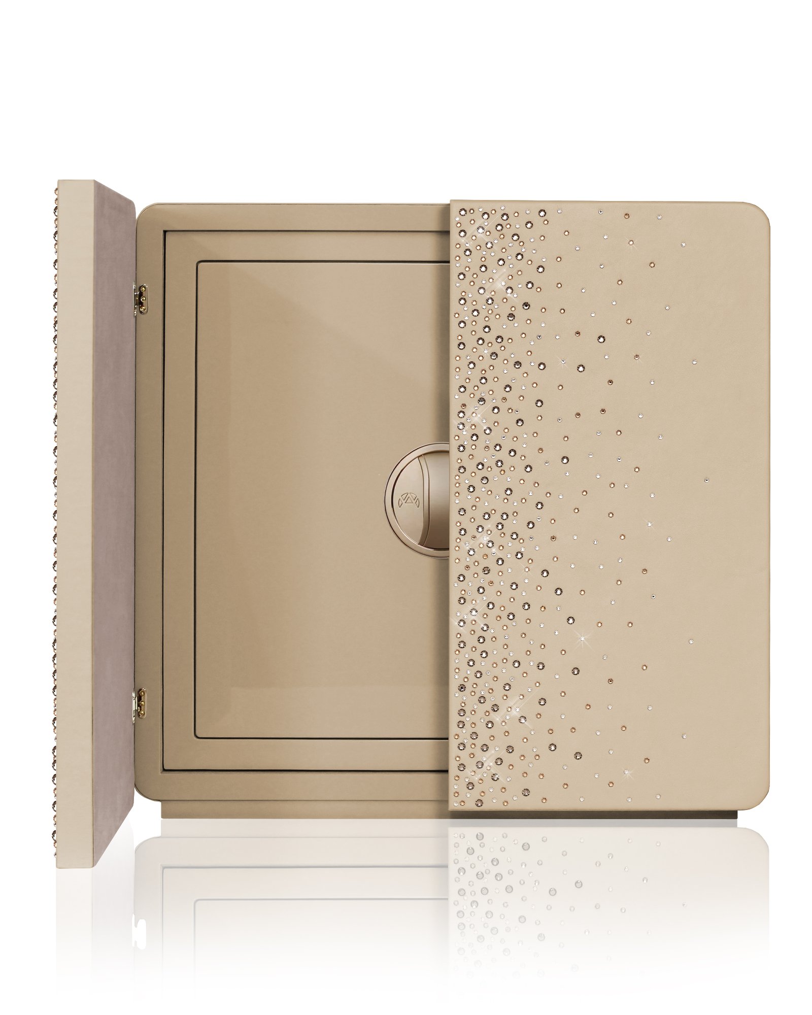 Сейф для хранения драгоценностей в отделке из бежевой кожи с оригинальными кристаллами Swarovski на дверцах, аксессуары из латуни, покрытой 24-каратным золотом. Круглая ручка со встроенным биометрическим замком и ключ аварийного открытия. Внутри выдвижное приспособление для бус и цепочек и ящики для драгоценностей. Вариант исполнения - в отделке из черной кожи с оригинальными кристаллами Swarovski на дверцах, аксессуары из рутения. РАЗМЕРЫ ШКАФА cm. 60x41x60,5