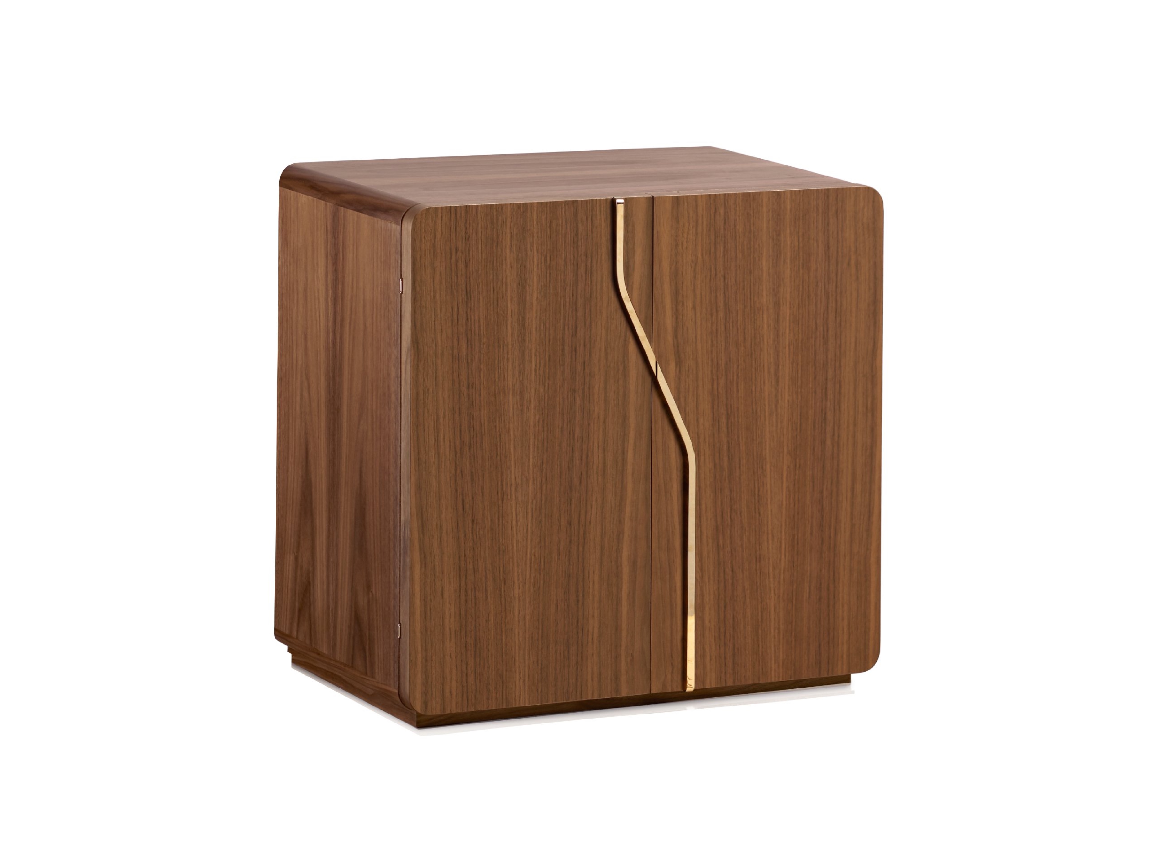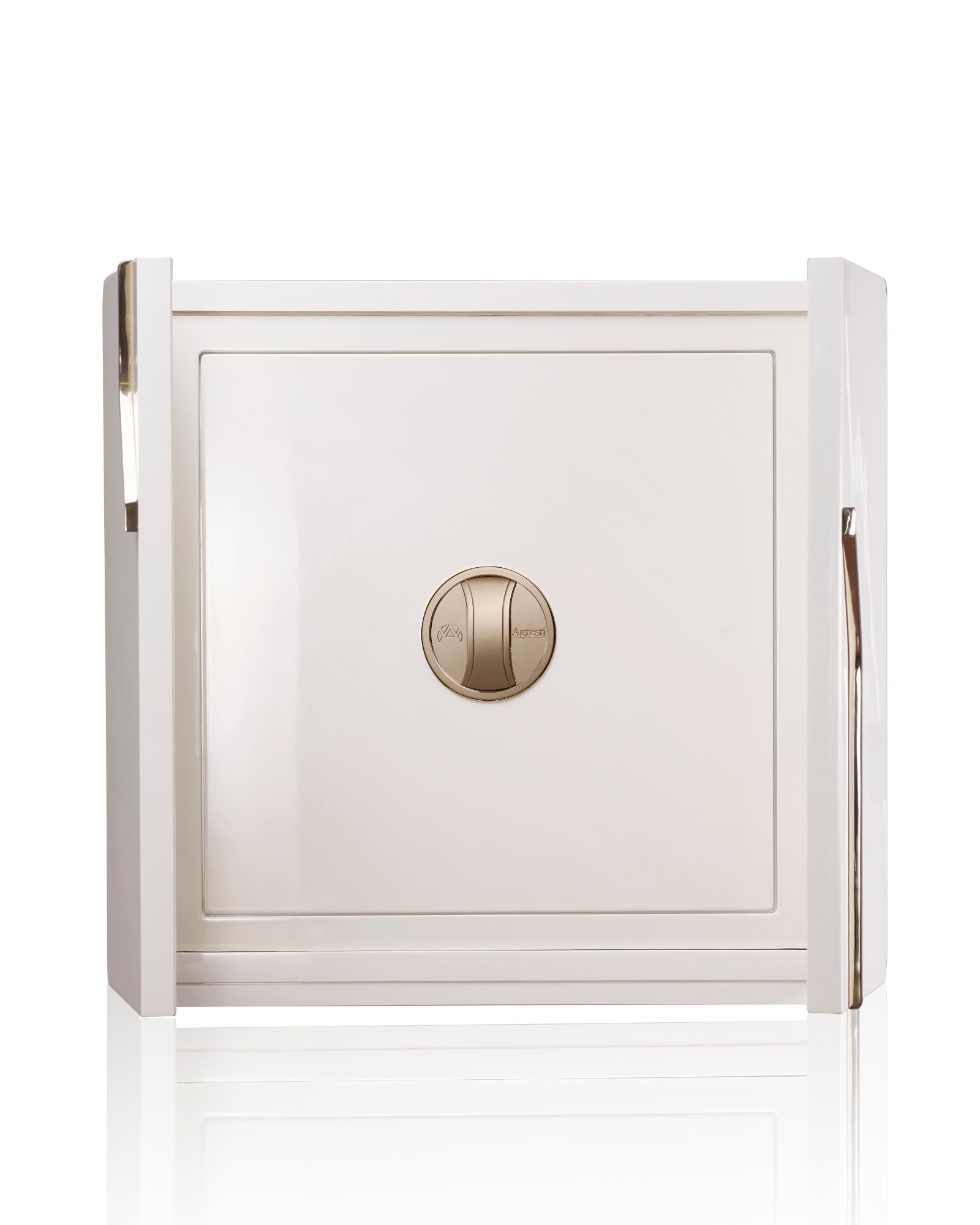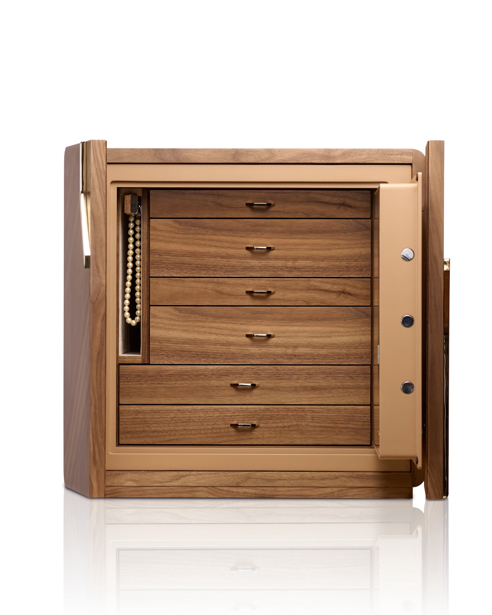 Сейф для хранения драгоценностей из орехового дерева Каналетто в матовой отделке. Аксессуары выполнены из латуни, покрытой золотом в 24 карата. Круглая ручка со встроенным биометрическим замком и ключом для чрезвычайных ситуаций. Внутри сейфа предусмотрены выдвижные приспособления для бус и цепочек и ящички для хранения ювелирных изделий. Вариант исполнения - из белого клена «птичий глаз» в глянцевой отделке. Аксессуары выполнены из латуни, покрытой золотом в 24 карата. РАЗМЕРЫ ШКАФА cm. 60x41x60,5