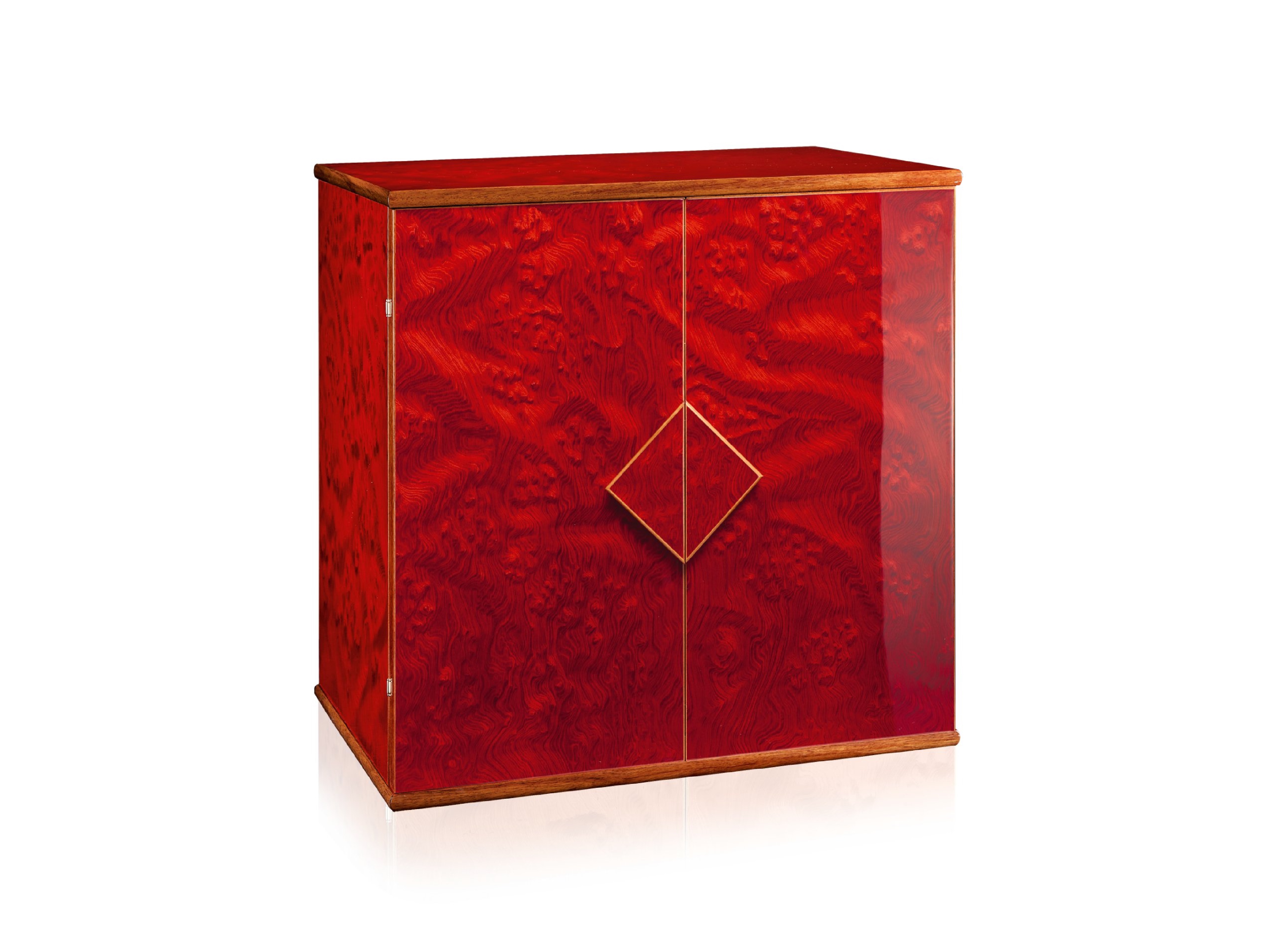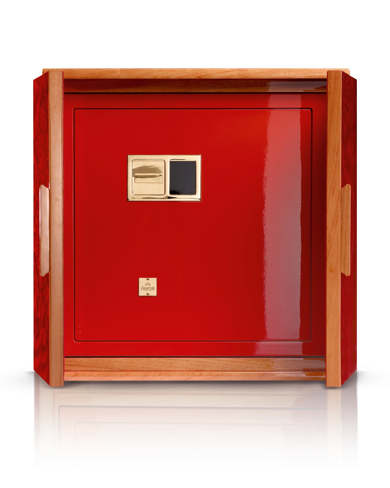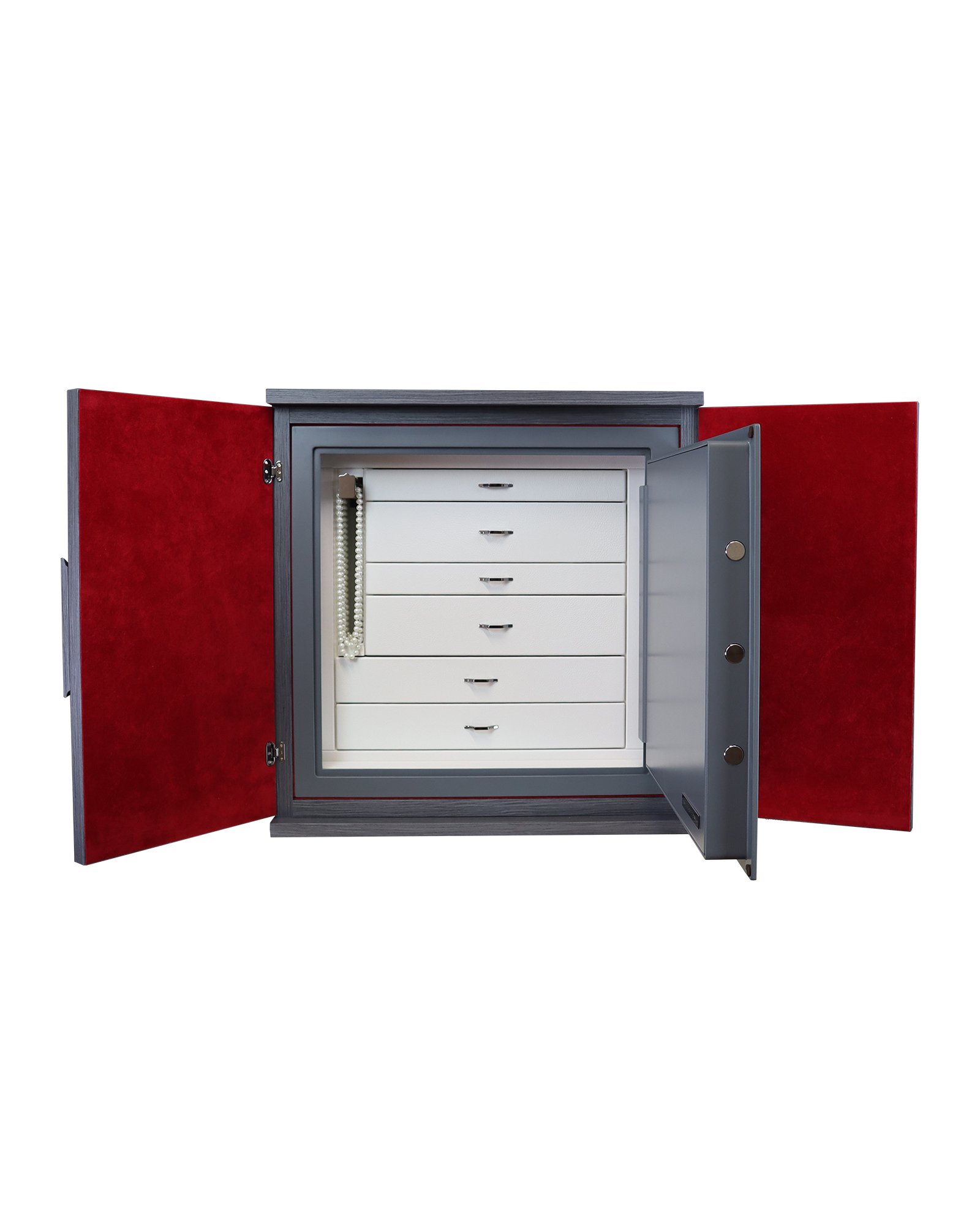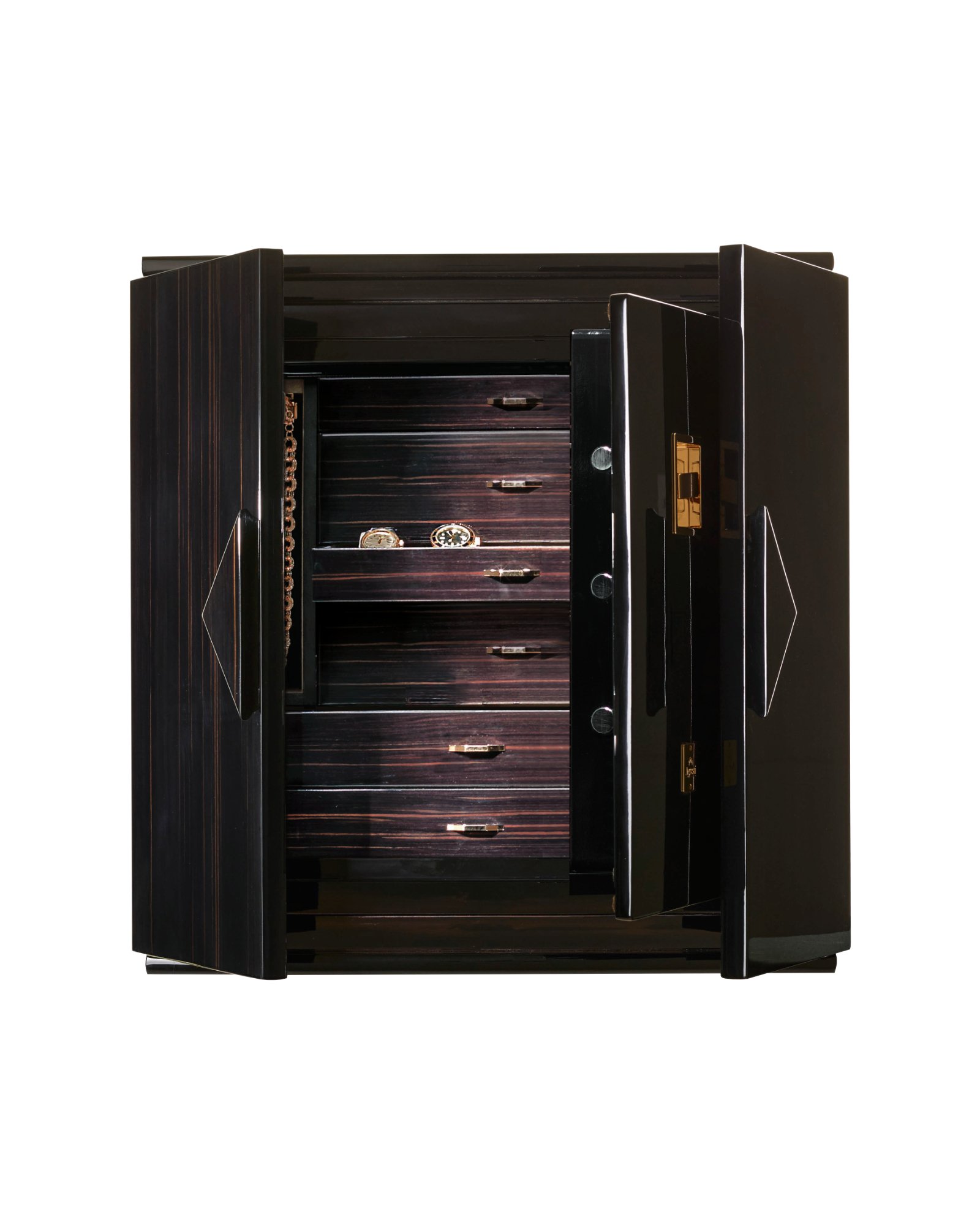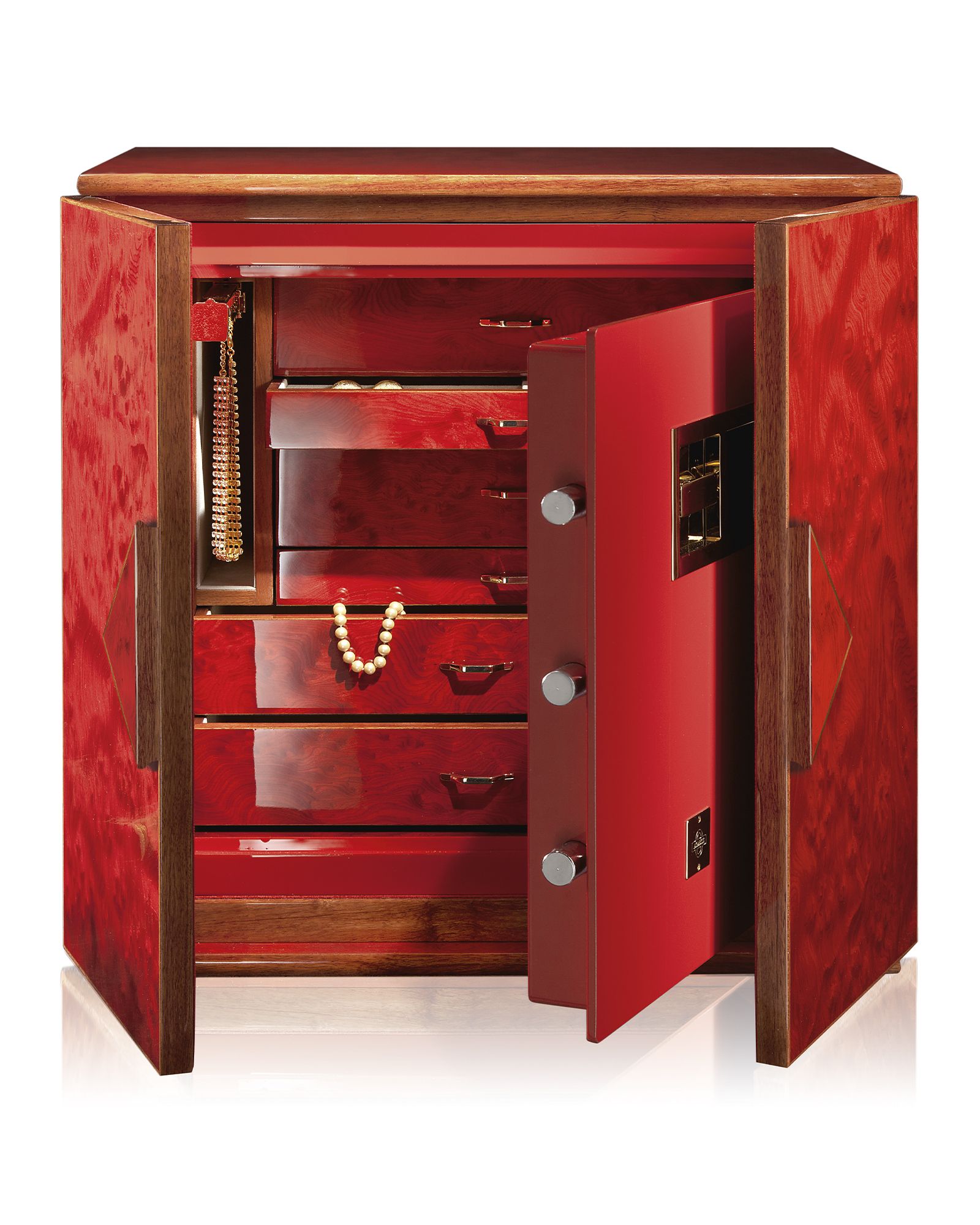 Cейф для хранения драгоценностей с выдвижными приспособлениями для бус и цепочек. Варианты исполнения: -Красная полированная радика. аксессуары выполнены из латуни, покрытой тонким слоем золота в 24 карата. Сейф внутри красный полированный. -Полированный белый клён. аксессуары выполнены из латуни, покрытой тонким слоем розового золота в 24 карата. Сейф внутри белый полированный. -Эбеновое полированное дерево, аксессуары выполнены из латуни, покрытой тонким слоем золота в 24 карата. Сейф внутри чёрный полированный. -Из дымчатосерого дуба в матовой отделке. Ящики в отделке из белой кожи, внутренняя отделка из красной ультразамши. Сейф внутри дымчатосерый матовый.