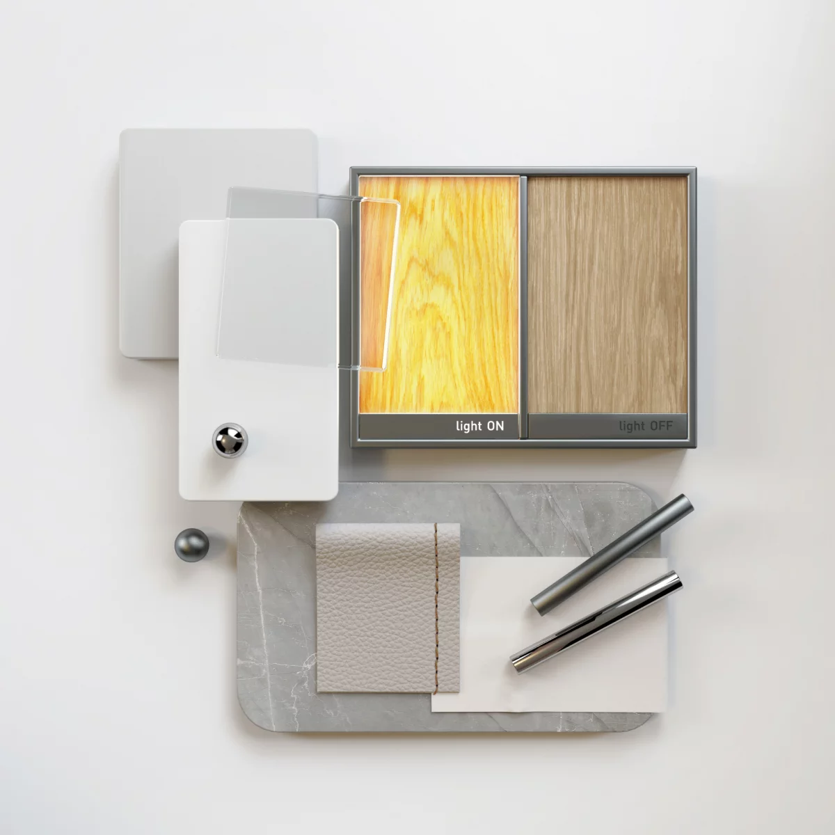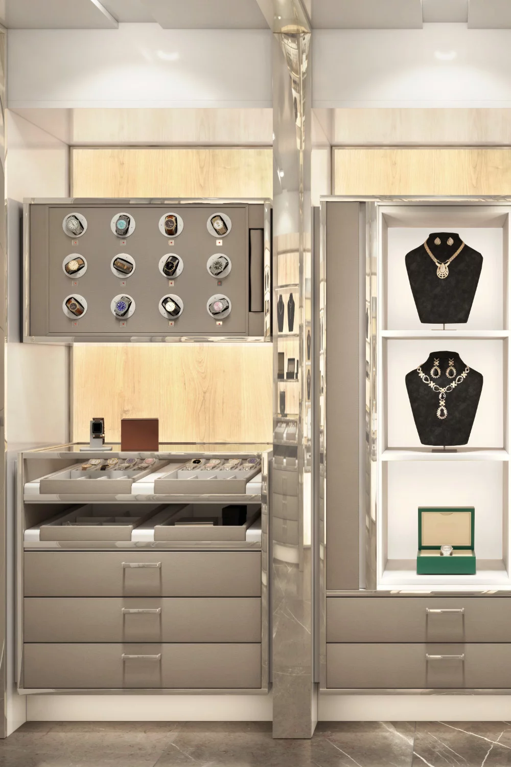 Нежное исполнение изысканных форм: Детали в отделке с эффектом металлик Полированное белое дерево Деревянные панели с подсветкой Тисненая кожа в коричневом цвете Белая ультразамша