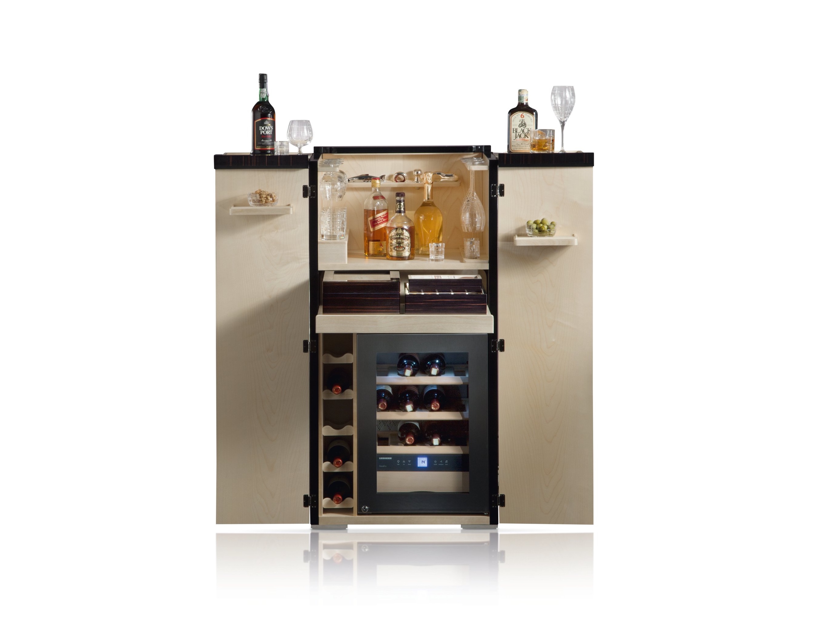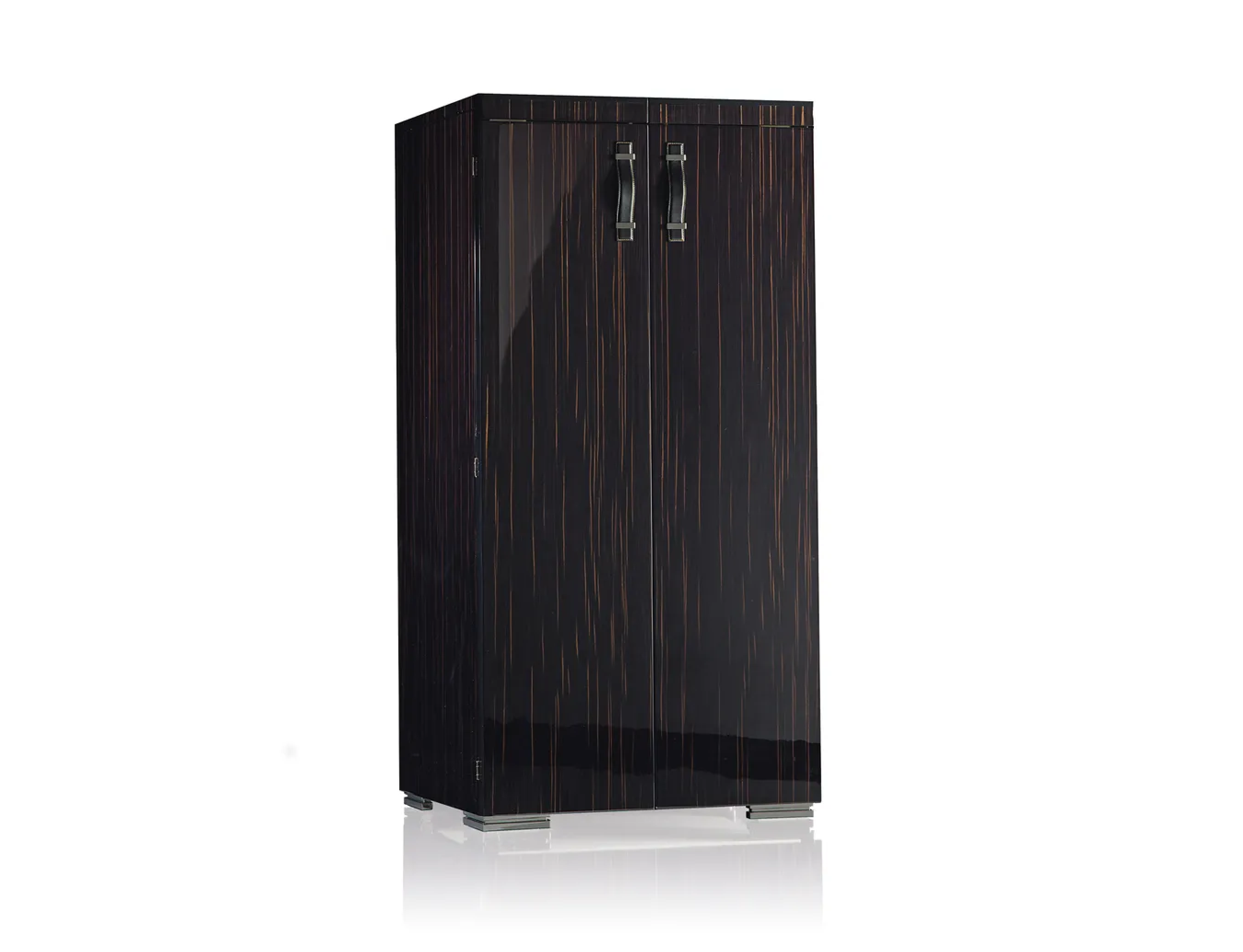 Шкаф-бар BACCO E TABACCO EBANO с двумя фронтальными дверками и крышкой, которые полностью открываются. Бар содержит: климатизированный винный погреб LIEBHERR для 12 бутылок с температурой от +5° до + 20°, набор из 16 хрустальных бокалов квадратной формы, аксессуары для вина. Ящичек внизу содержит выдвижную коробку для хранения 30 сигар, фишки, игральные карты, кости для покера и кожаные стаканы. Cделан из эбенового полированного дерева, внутри он выполнен из клёна.
