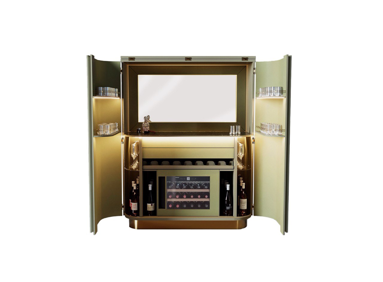 Шкаф-бар из дерева в волнистой отделке и с деталями из полированной латуни. Две передние дверки и крышка открывающиеся. Внутри мраморная столешница с отделениями и набором хрустальных бокалов. В глубине шкафа зеркало. На внутренней стороне дверей полочки из закаленного стекла для бокалов. Ящик для вина и барных аксессуаров, а также ящик для сигар, оснащенный гигрометром и двумя увлажнителями. В нижней части климатизированный винный погреб LIEBHERR для 18 бутылок вина. Внутренняя отделка из кожи и полированной латуни. Светодиодная подсветка. РАЗМЕРЫ cm. В128,5 x Ш73 x Г160