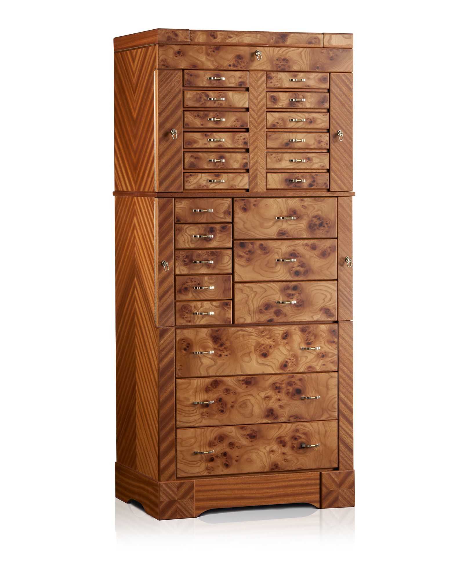 Шкаф из корневища вяза и красного дерева матовой отделки. Двадцать ящичков закрываются на ключ, они - различной наполняемости для любого типа драгоценностей. Три нижних крупных ящичка не имеют замка. По бокам верхней части шкафа располагаются два выдвижных приспособления для бус и цепочек и два складных. Регулируемое зеркало и секретное отделение. Шкатулка для путешествий размером, подходящим для хранения в гостиничном сейфе. РАЗМЕРЫ ШКАФА cm. 57,2x39,7x128,2