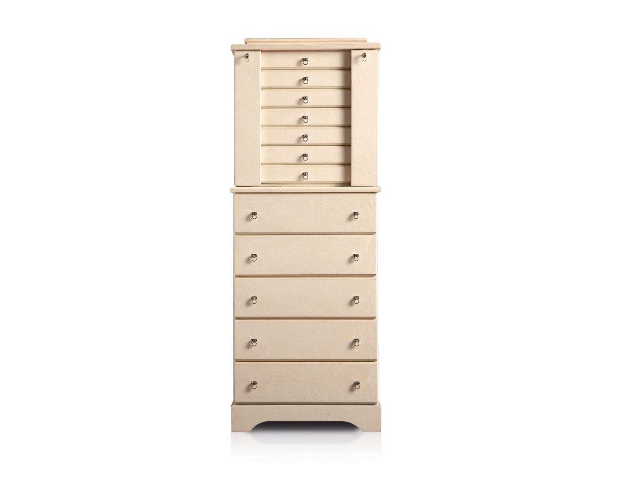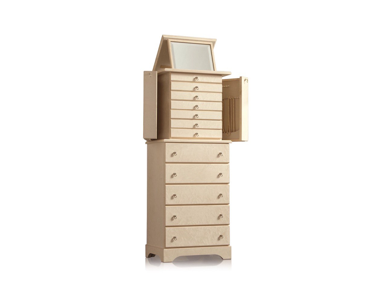 Шкаф LO SCRIGNO CREMA для хранения драгоценностей из клёна «птичий глаз» кремового цвета матовой отделки, внутренняя часть выполнена из мягчайшей замши. Аксессуары выполнены из латуни, покрытой тонким слоем золота в 24 карата. Боковые створки шкафа для хранения цепочек различных размеров закрываются на ключ. Шесть верхних ящичков закрываются на ключ, они - различной наполняемости для любого типа драгоценностей. В верхнюю часть вмонтировано регулируемое зеркало, в то время как пять вместительных ящиков в нижней части шкафа можно использовать для хранения шарфов, белья, личных вещей.
