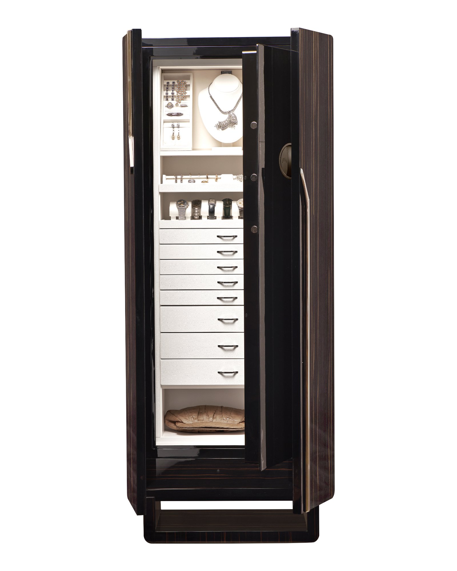 Cейф для хранения драгоценностей из полированного эбенового дерева, аксессуары из рутения. Круглая ручка со встроенным биометрическим замком и ключ аварийного открытия. Внутри подставка для ожерелий и съемные подносы для ювелирных изделий. Секретное отделение. РАЗМЕРЫ ШКАФА cm. 60x41x160,5