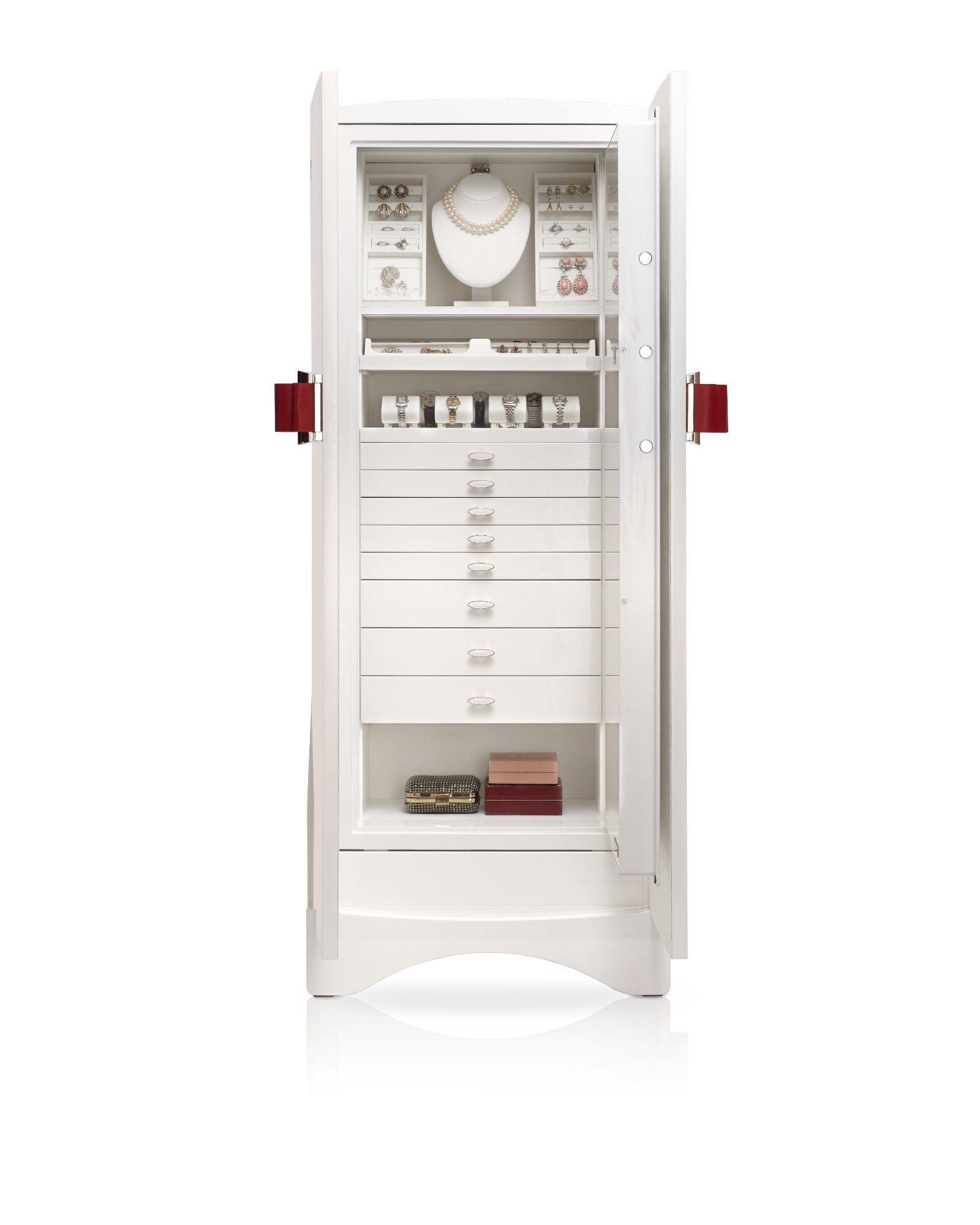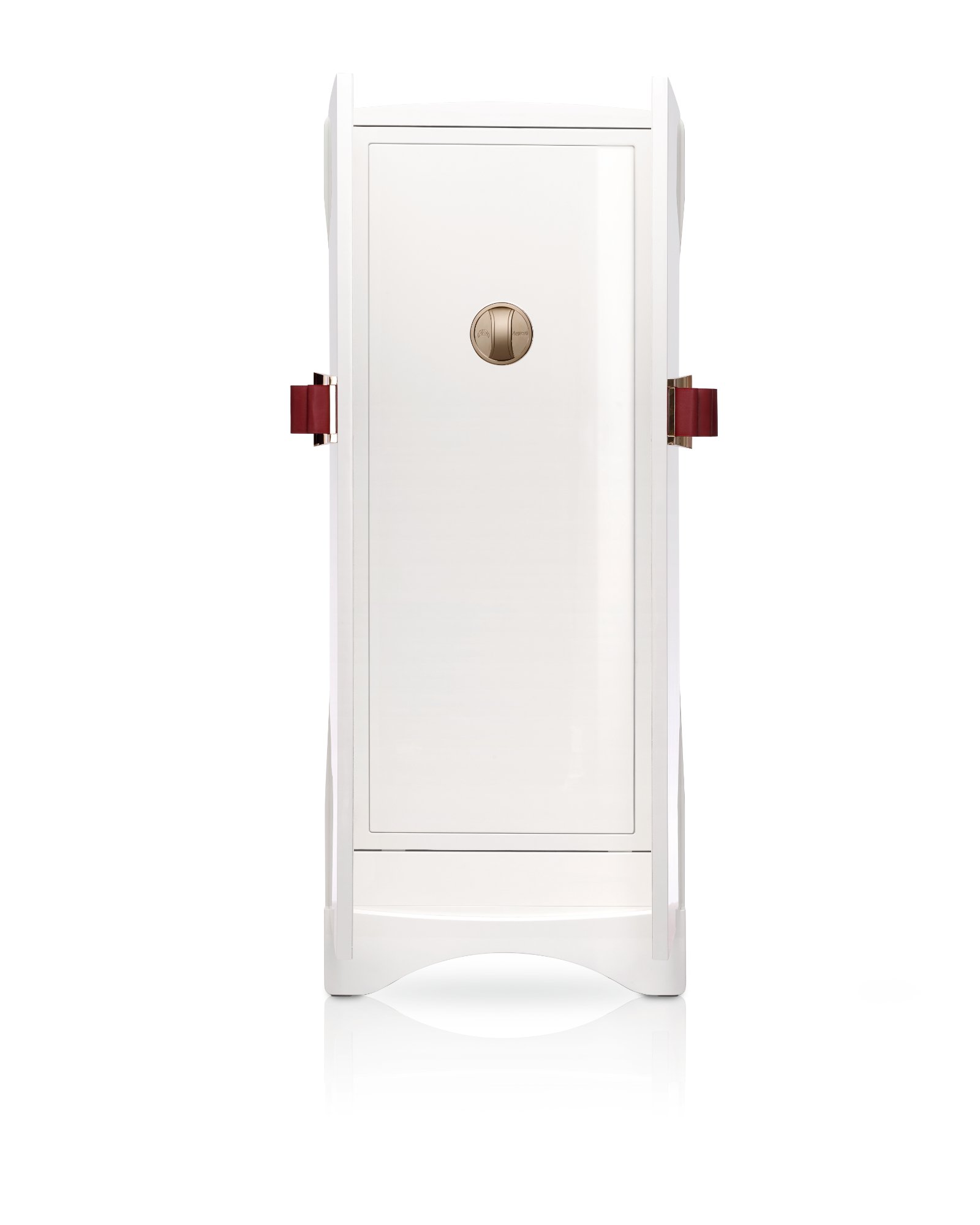 Сейф для хранения драгоценностей, белый глянцевый с кожаной отделкой «бант». Аксессуары выполнены из латуни, покрытой золотом 24 карата. Круглая ручка со встроенным биометрическим замком и ключом для чрезвычайных ситуаций. Внутри сейфа предусмотрены выдвижные приспособления для бус и цепочек и ящички для хранения ювелирных изделий. Ручки ящичков выполнены из кожи. Секретное отделение. РАЗМЕРЫ ШКАФА cm. 65x46x160,5