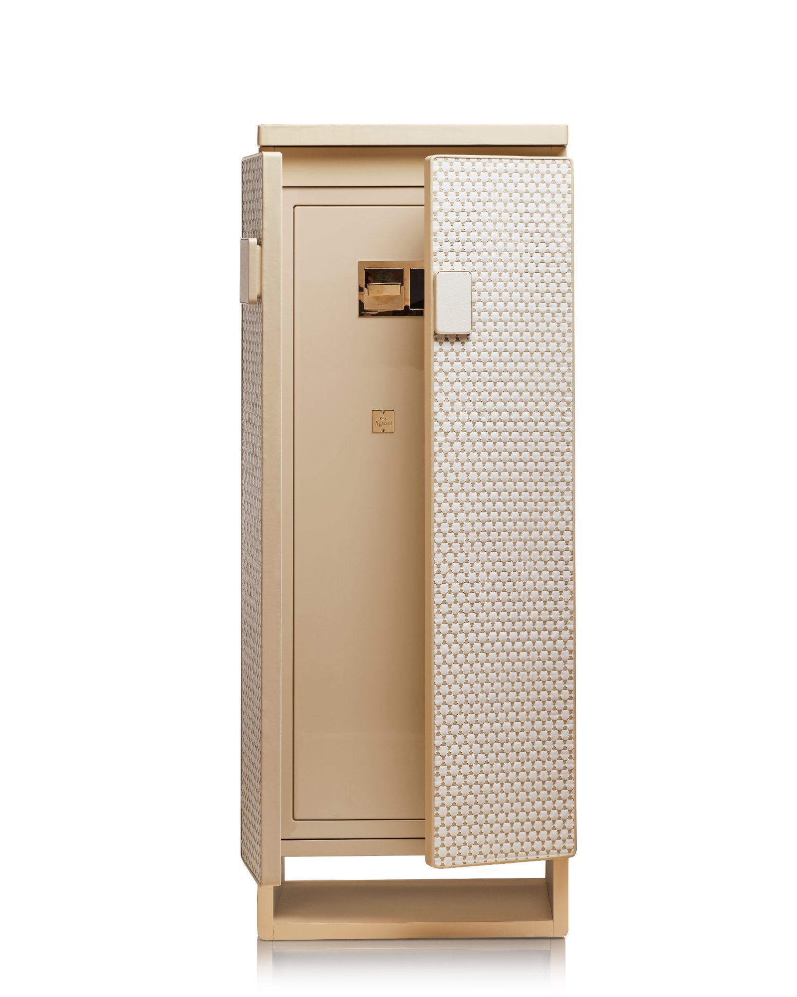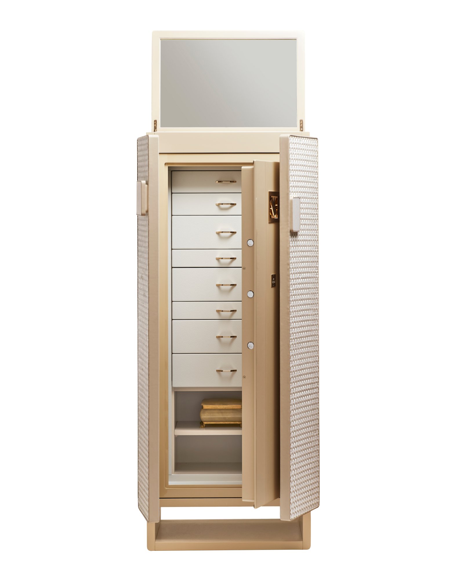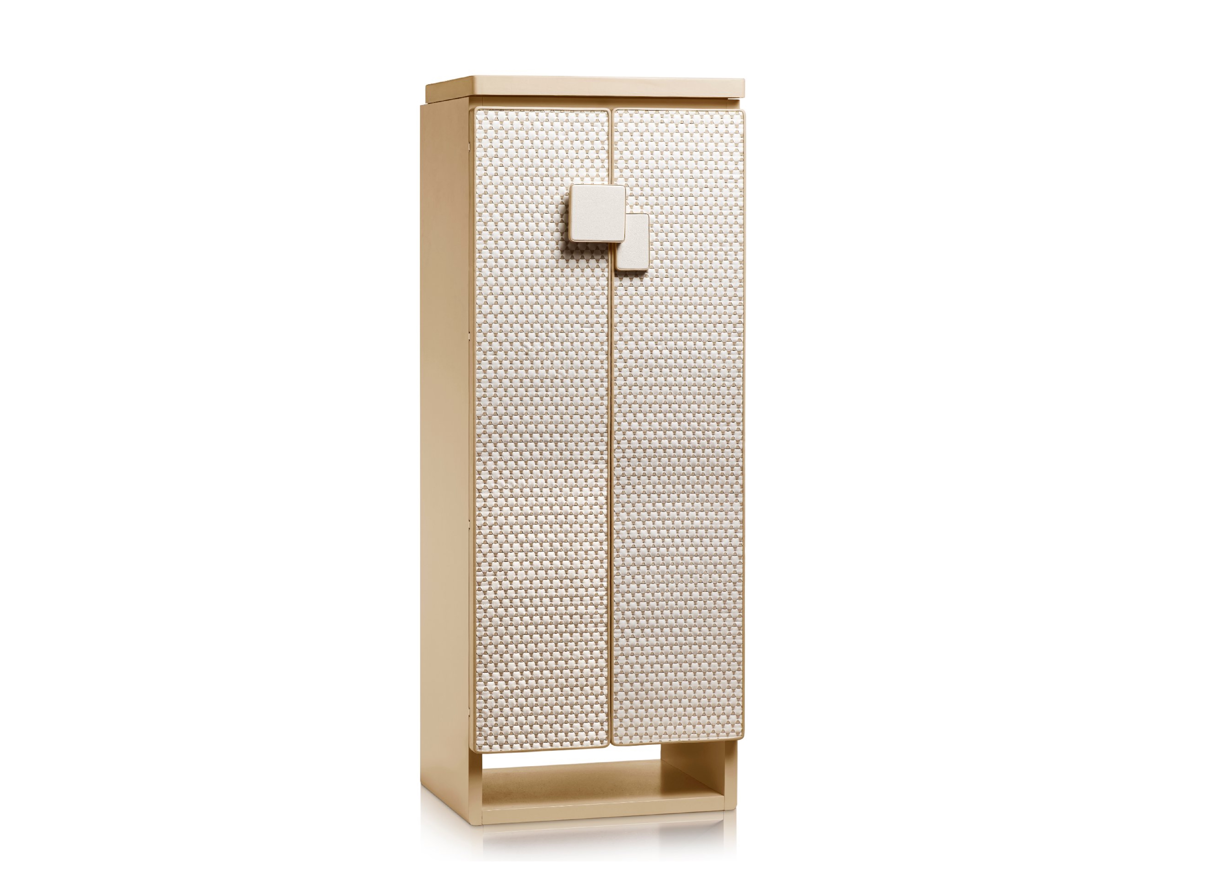 Сейф со шкафом в отделке из белой и бежевой плетеной кожи, ручная работа, аксессуары из латуни, покрытой 24-каратным золотом. РАЗМЕРЫ ШКАФА cm. 52x40x135