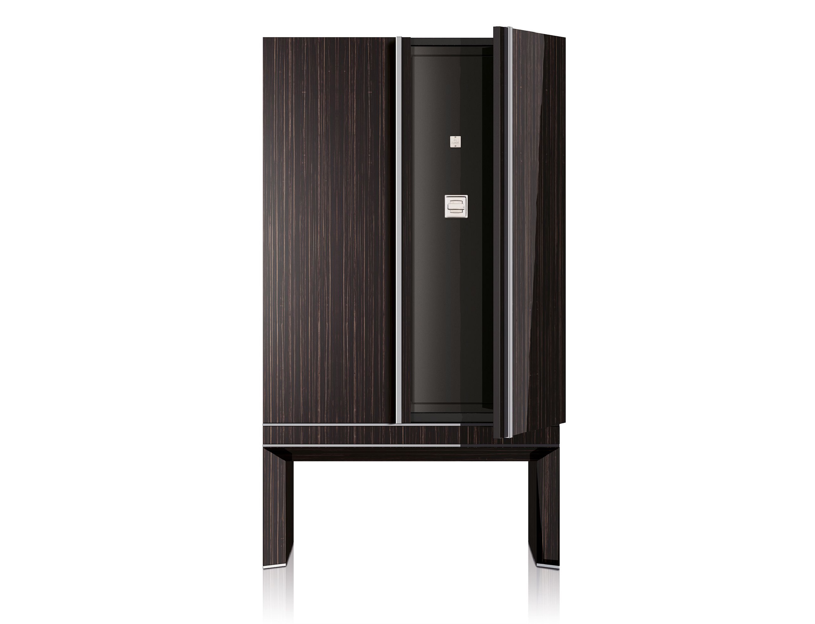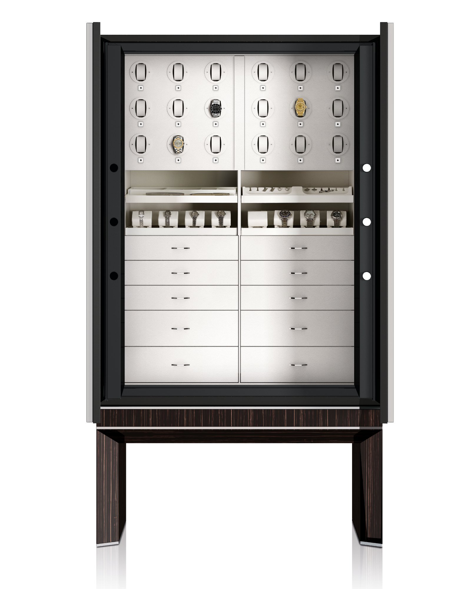 Сейф для хранения ювелирных изделий. Шкаф из полированного эбенового дерева. Аксессуары выполнены из отделанной рутением латуни. Внутри сейф с биометрическим замком, ящички и выдвижные подставки. Возможно вставить 18-36-54 Швейцарских механизмов для подзарядки автоматических часов. Два секретных отделения.