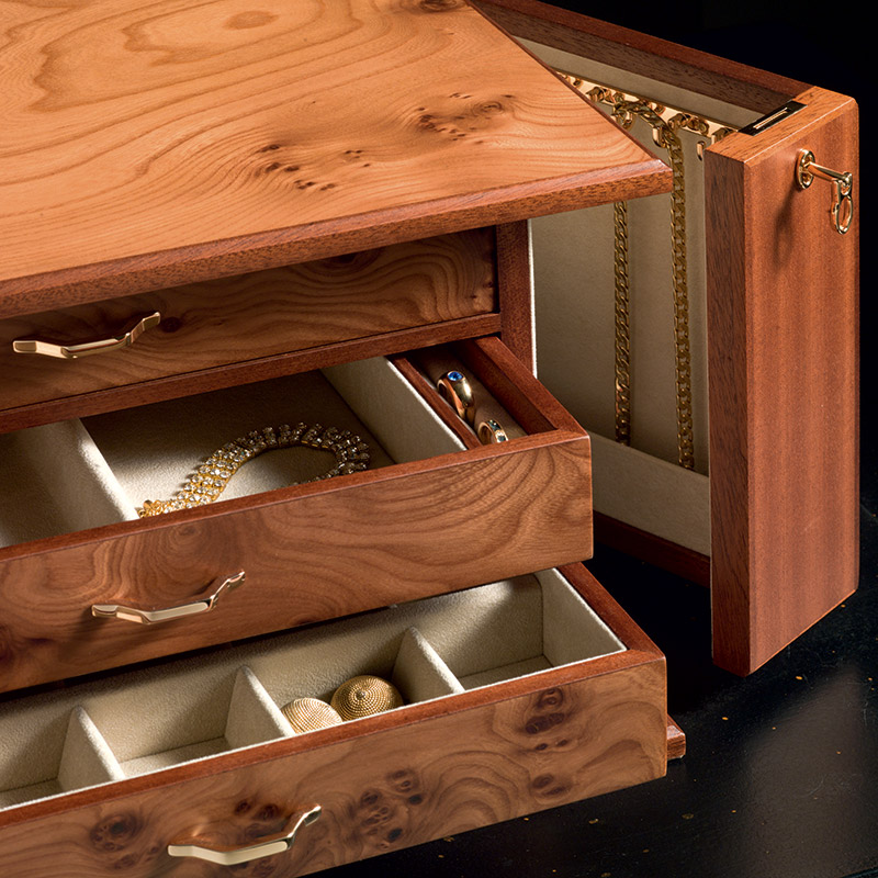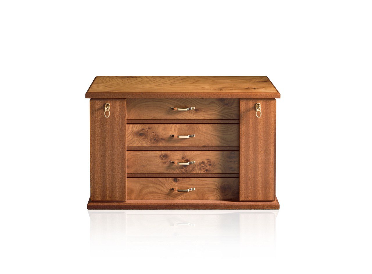 Шкатулка для хранения драгоценностей из радики и красного дерева, покрытие матовое, внутренняя часть сделана из мягчайшей замши. Аксессуары выполнены из латуни, покрытой тонким слоем золота в 24 карата. C 4 ящичками. Две створки с приспособлениями для хранения бус и цепочек закрывают все ящички. РАЗМЕРЫ ИЗДЕЛИЯ cm. 40x25x25