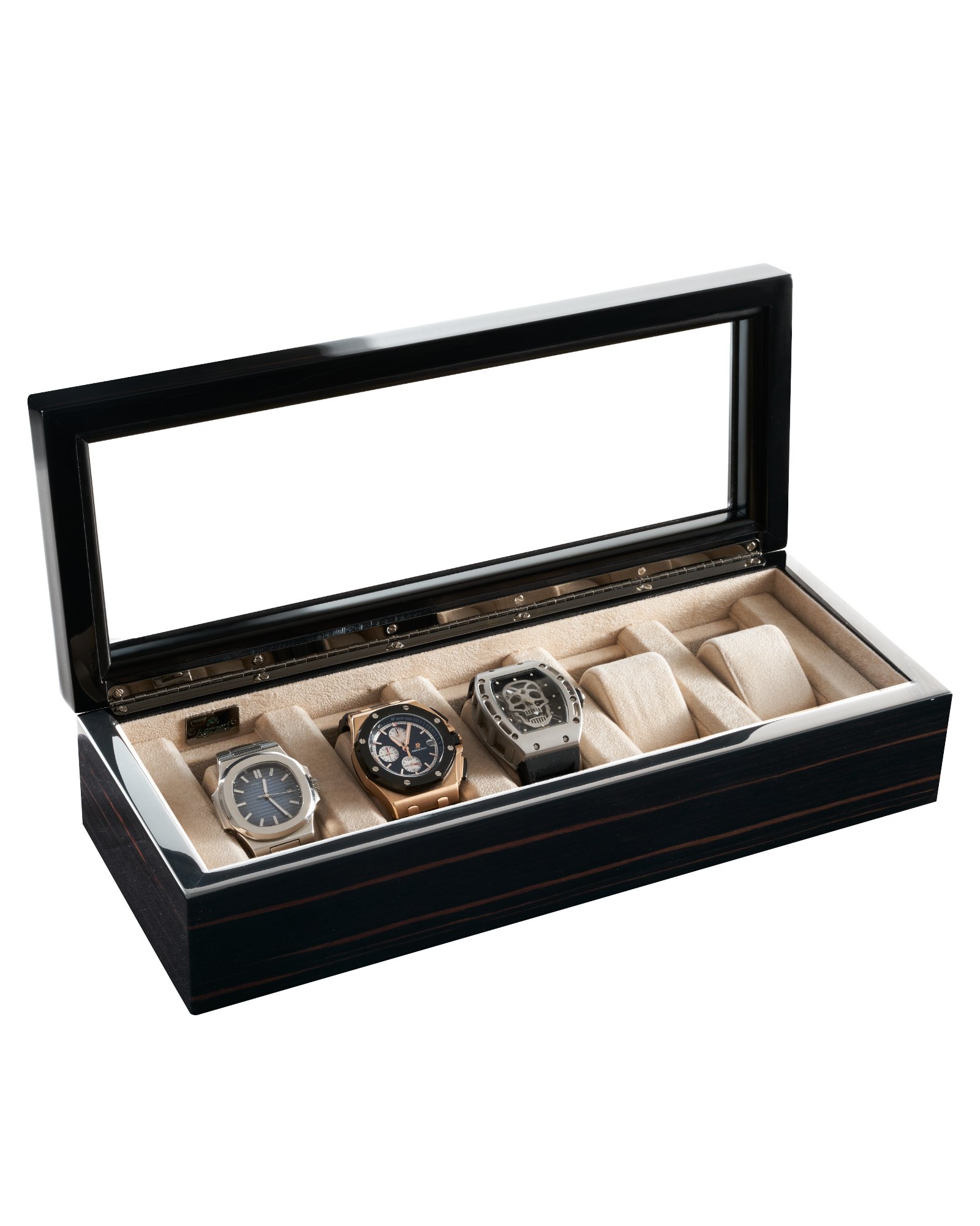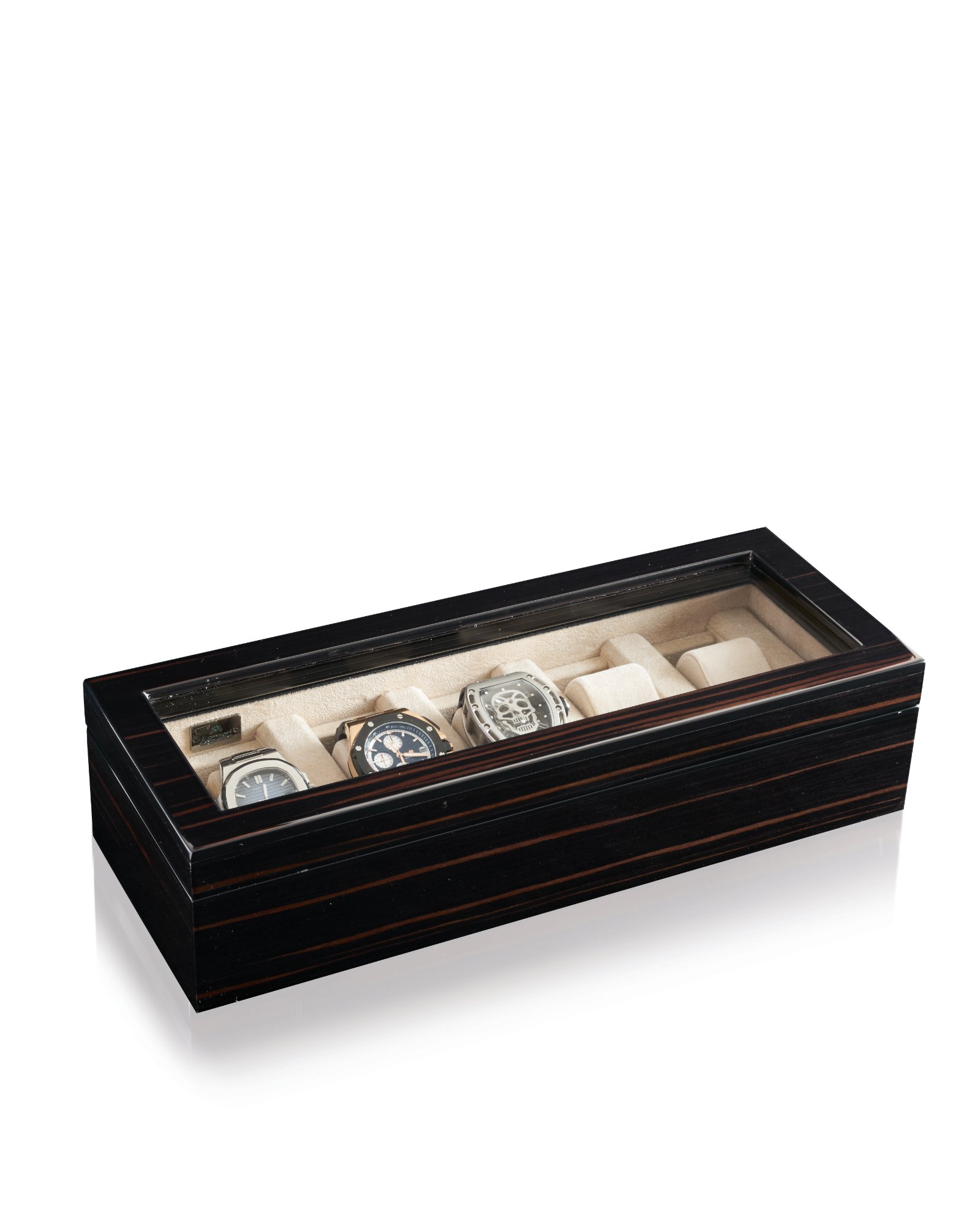 Шкатулка из полированного эбенового дерева для 5 часов, с внутренней отделкой из защитной ультразамши. Петли из рутения. РАЗМЕРЫ ИЗДЕЛИЯ cm. 36,2x13,8x8,6