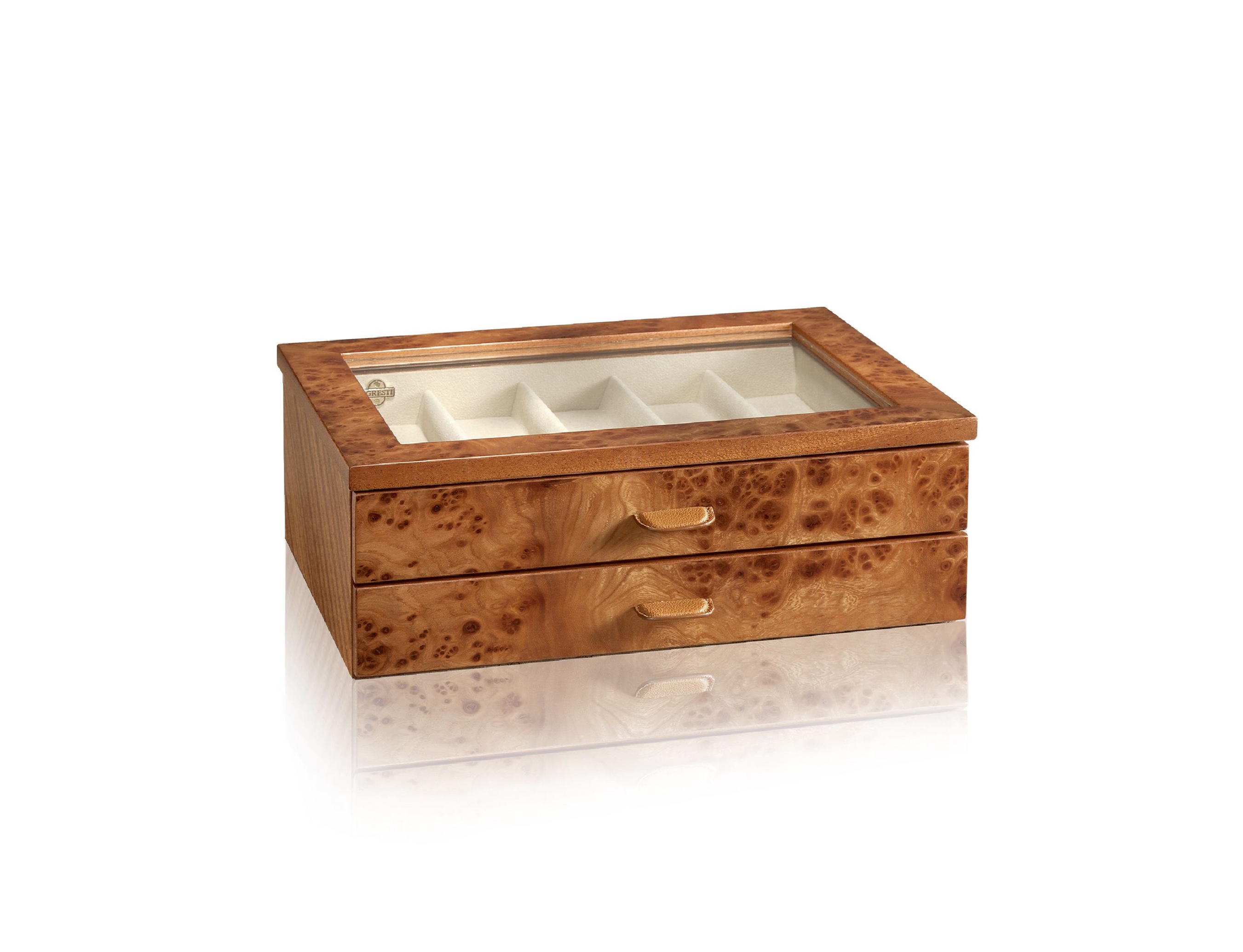 Шкатулка для хранения часов изготовлена из корня вяза и красного дерева. Внутри покрытие из защитной замши. Ручки из кожи. Шкатулка предназначена для хранения 9-ти часов. Шкатулка Agresti станет великолепным подарком ценителям времени и красивых вещей. 31x25x11h cm