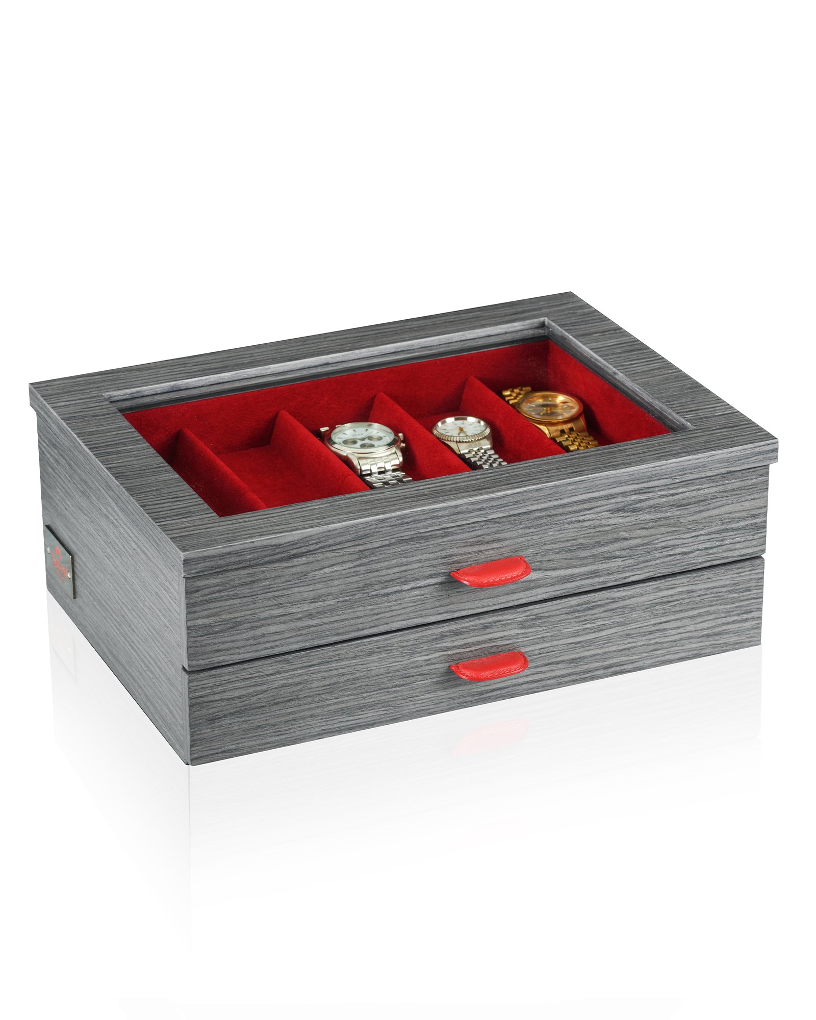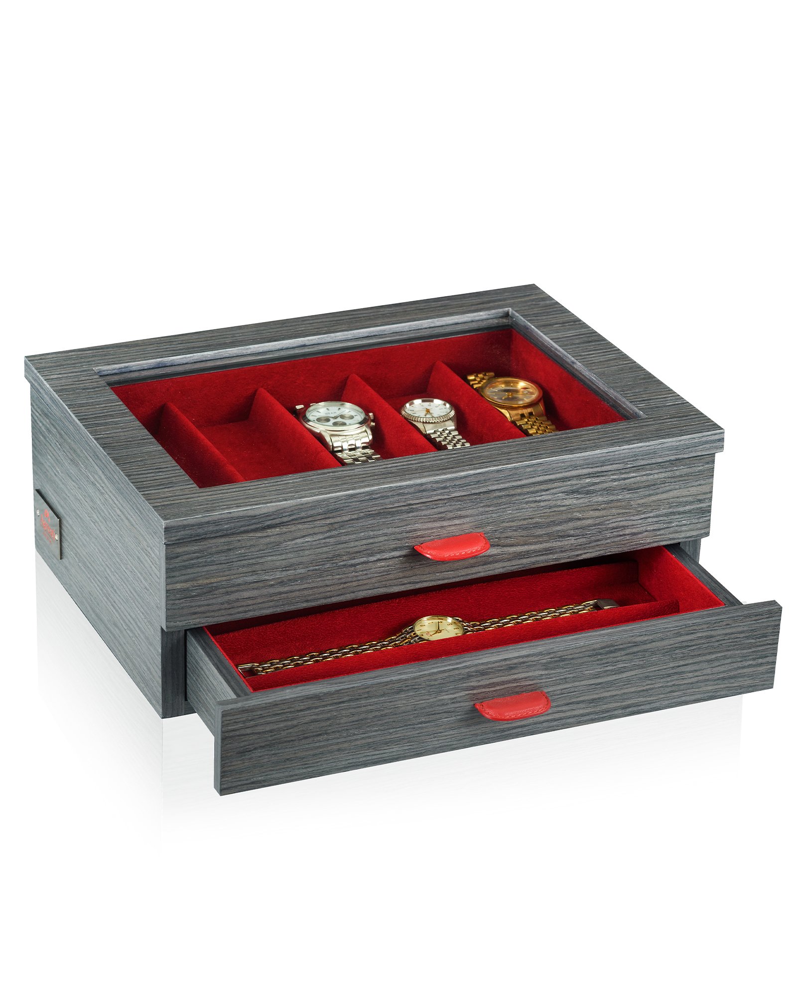 Комод с двумя ящиками для 9 часов из дымчато-серого дуба. Внутренняя отделка из ультразамши красного цвета и ручки из красной кожи. РАЗМЕРЫ ИЗДЕЛИЯ cm. 31x24,6x11,2