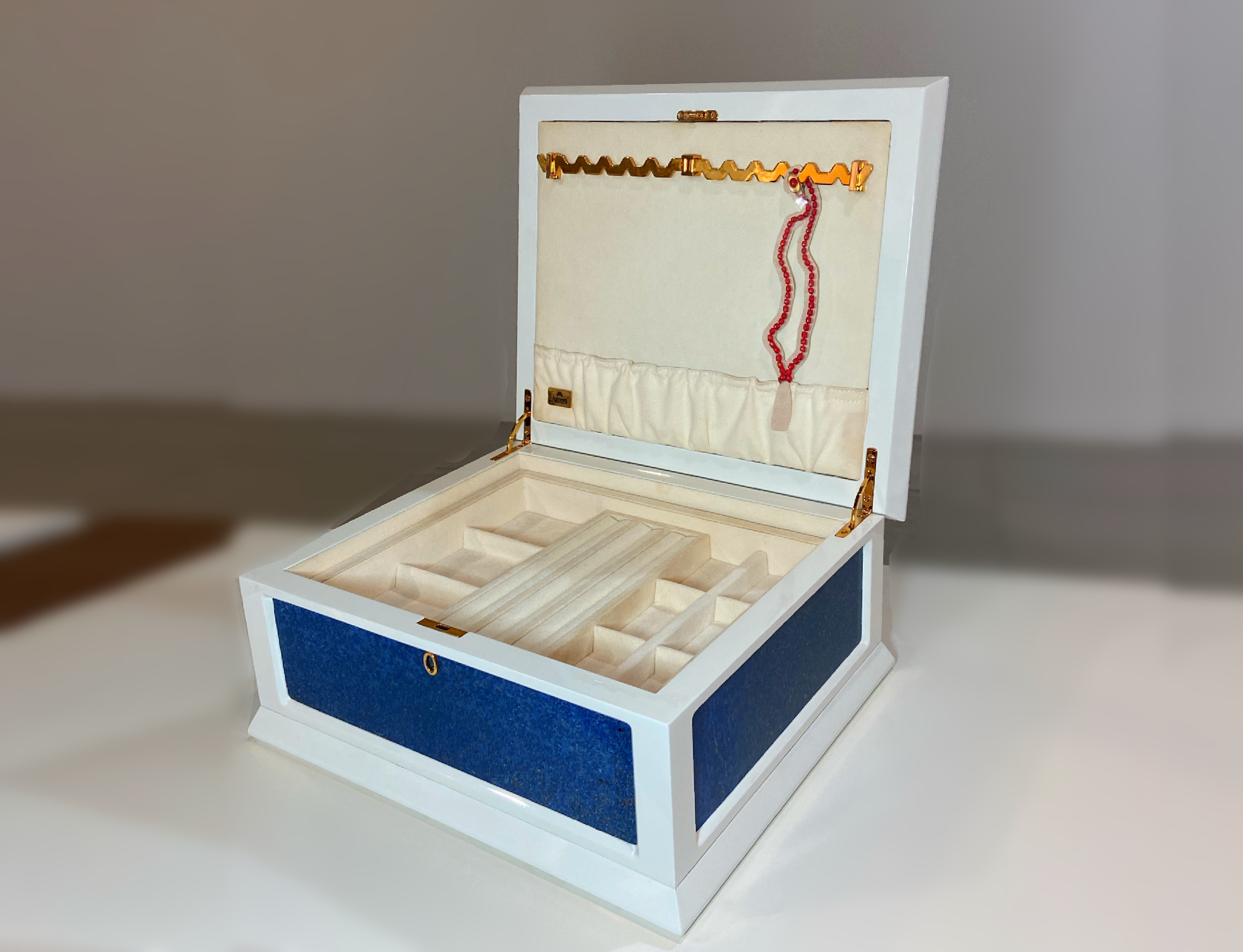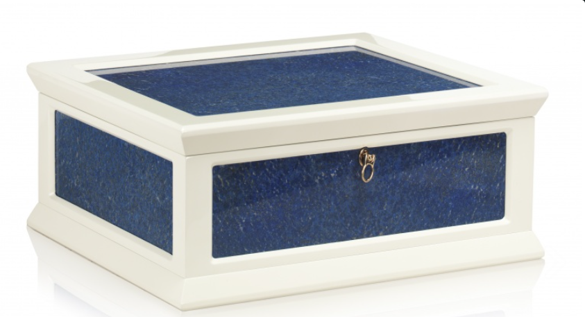 Шкатулка для хранения драгоценностей TECA LAPIS белая полированная со вставками из лазурита. Металлические аксессуары покрыты тонким слоем 24-каратного розового золота. Внутри съемный поднос и держатель для бус и цепочек. 35.6x30.5x15.5h cm