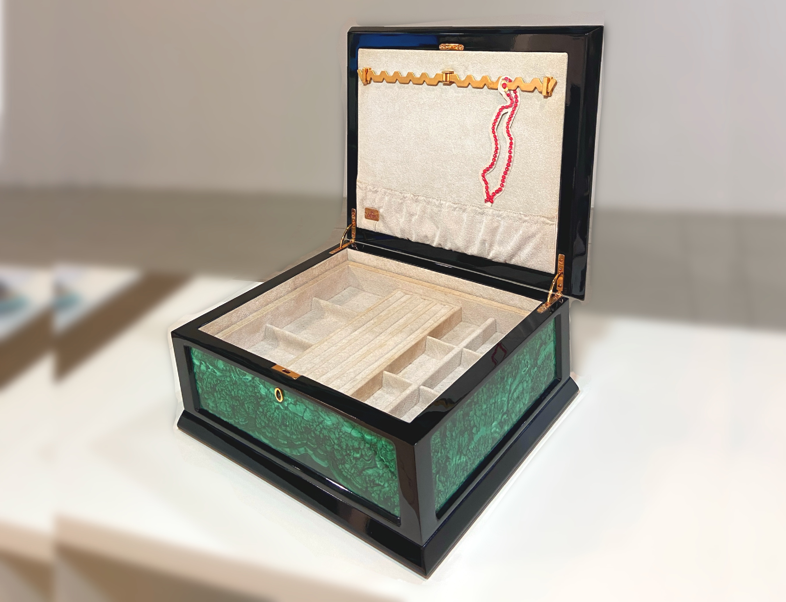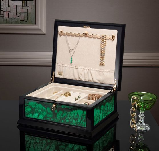 Шкатулка TECA MALACHITE для хранения драгоценностей черная полированная со вставками из малахита. Металлические аксессуары покрыты тонким слоем 24-каратного розового золота. Внутри съемный поднос и держатель для бус и цепочек. 35.6x30.5x15.5h cm