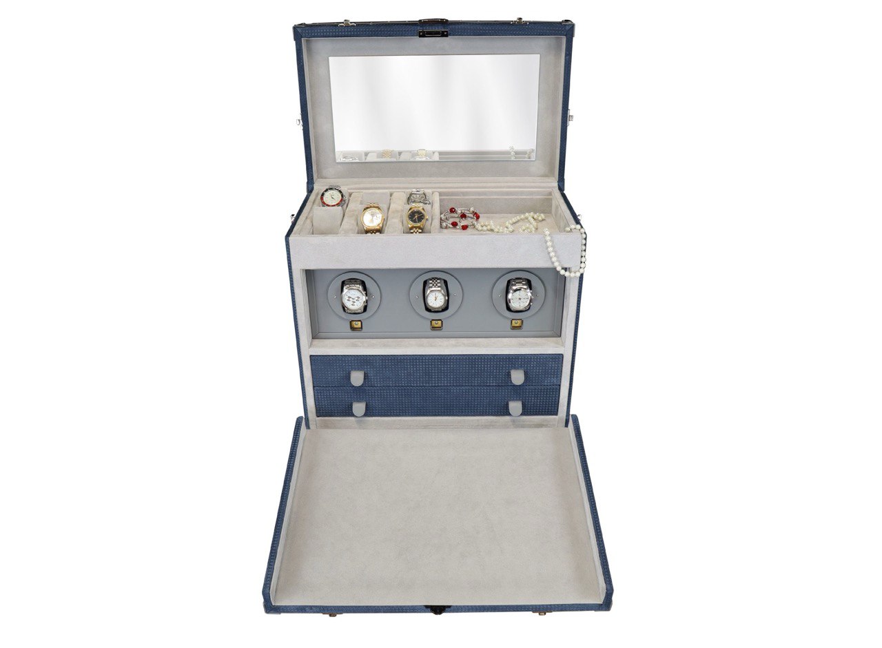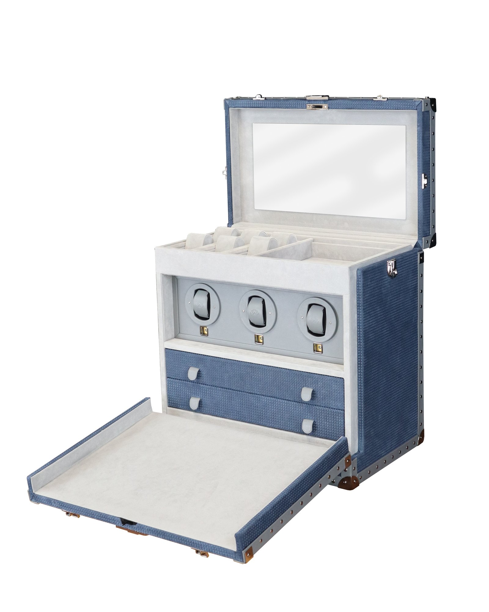 Дорожный сундук, обтянутый кожей, аксессуары из полированной стали. Замок с ключом. Внутри три механизма для подзавожа часов. швейцарского производства и ящики для ювелирных изделий. Облицованные кожей передние части ящиков и замшевые отделанные интерьеры Размеры: cm W47 x D29 x H45