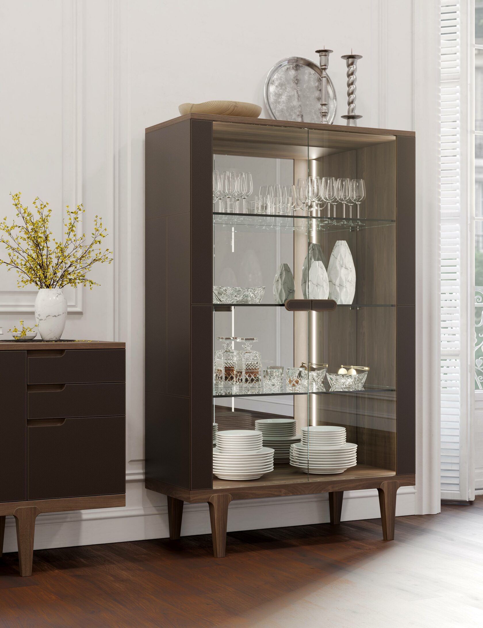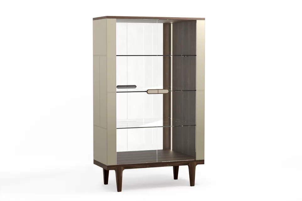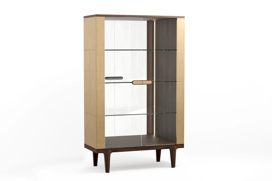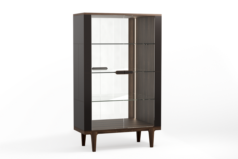 Витрина 1100х470x1800 Обивка - натуральная кожа в трех цветах, массив - орех, дуб или ясень Коллекция VINTAGE Эргономичность в сочетании с простотой и скульптурность силуэтов. Кожаные элементы напоминают сложенные из крупных блоков фасады модернистских зданий. Внимание к деталям, органичное соответствие окружающему пространству и неуловимое настроение «безвременья».