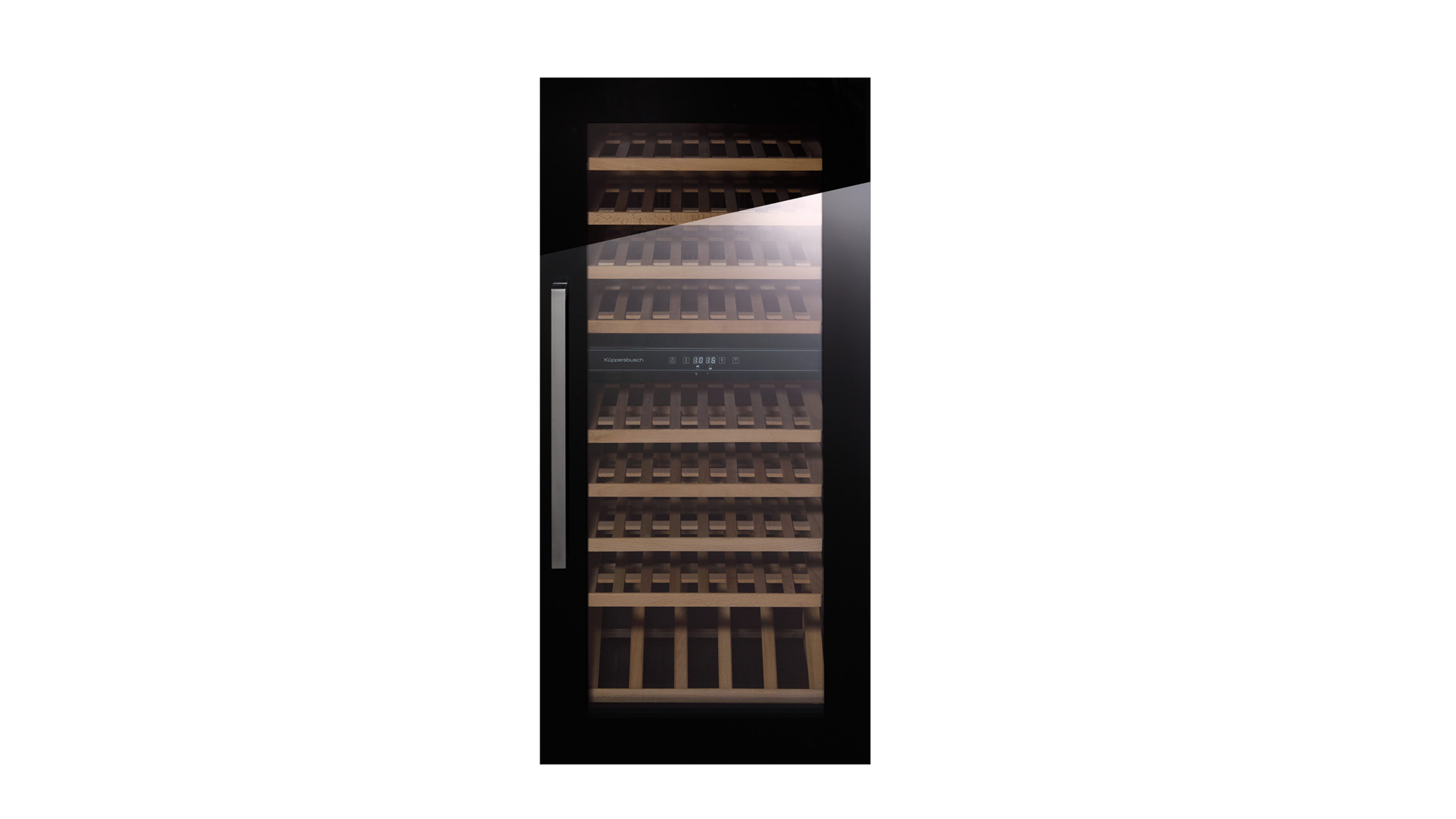 Kuppersbusch FWK 4800.0 S1 Электронная система регулировки температуры с нажимными кнопками Электронная индикация температуры 8 съемных выдвижных полок из дерева 1 деревянная полка для демонстрации под углом 45° Дверь с черным стеклом и защитой от ультрафиолетовых лучей Вместимость: 79 бутылок 2 разделенные температурные зоны, регулирование в диапазоне 5-18°C Светодиодная подсветка (по 2 светодиода мощностью 0,2 кВт на каждую зону) Система охлаждения посредством динамической циркуляции воздуха Звуковая сигнализация Изменяемая навеска двери Резервуар для воды для дополнительного увлажнения Максимальный угол открытия двери: 90° Без ручки